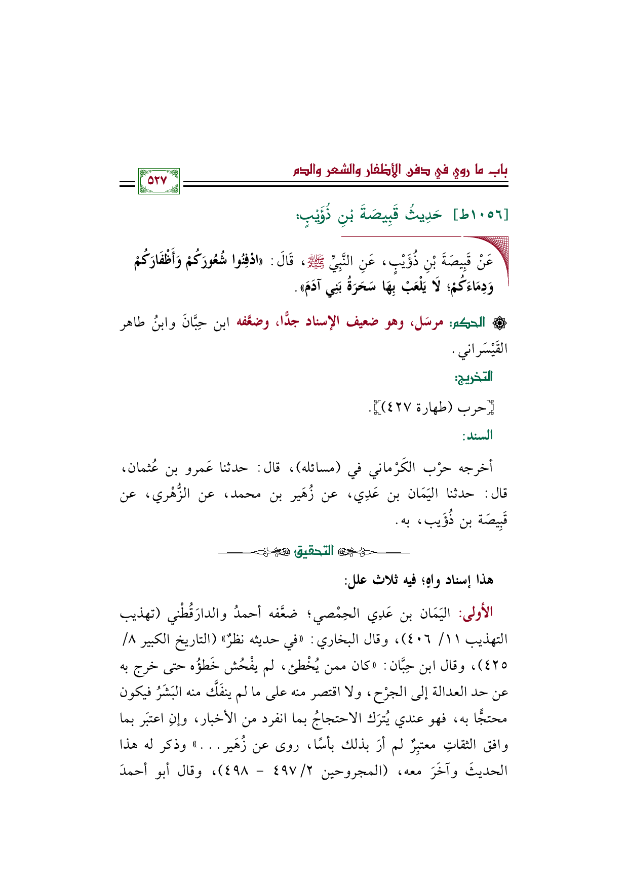 أخرجه حرْب الكَرْماني في (مسائله)، قال: حدثنا عَمرو بن عُثمان، قال: حدثنا اليَمَان بن عَدِي، عن زُهَير بن محمد، عن الزُّهْري، عن قَبِيصَة بن ذُؤَيب، به.