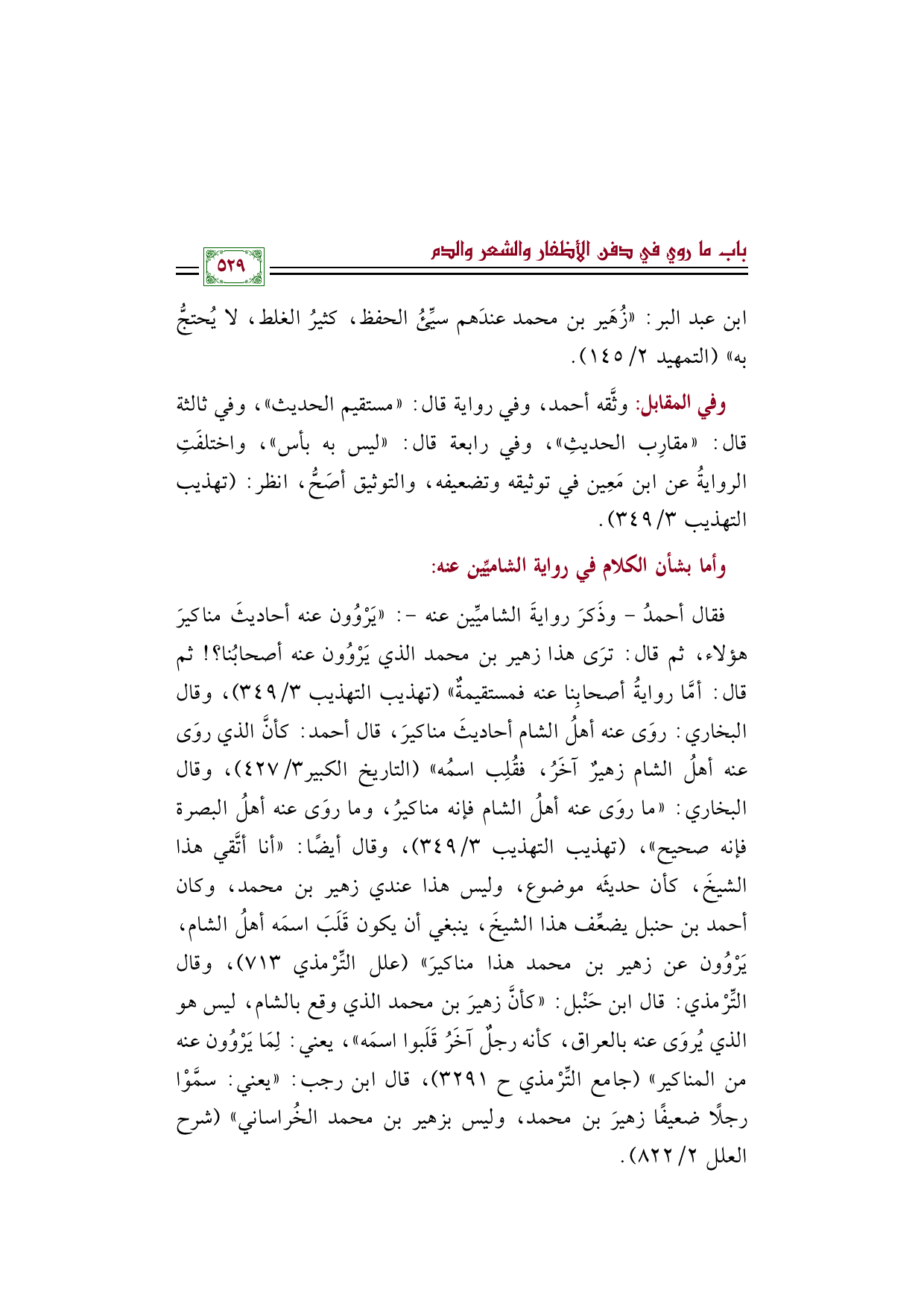فقال أحمدُ-وذَكرَ روايةَ الشاميِّين عنه-: "يَرْوُون عنه أحاديثَ مناكيرَ هؤلاء، ثم قال: ترَى هذا زهير بن محمد الذي يَرْوُون عنه أصحابُنا؟ ! ثم قال: أمَّا روايةُ أصحابِنا عنه فمستقيمةٌ" (تهذيب التهذيب ٣/ ٣٤٩)، وقال البخاري: روَى عنه أهلُ الشام أحاديثَ مناكيرَ، قال أحمد: كأنَّ الذي روَى عنه أهلُ الشام زهيرٌ آخَرُ، فقُلِب اسمُه" (التاريخ الكبير ٣/ ٤٢٧)، وقال البخاري: "ما روَى عنه أهلُ الشام فإنه مناكيرُ، وما روَى عنه أهلُ البصرة فإنه صحيح"، (تهذيب التهذيب ٣/ ٣٤٩)، وقال أيضًا: "أنا أتَّقي هذا الشيخَ، كأن حديثَه موضوع، وليس هذا عندي زهير بن محمد، وكان أحمد بن حنبل يضعِّف هذا الشيخَ، ينبغي أن يكون قَلَبَ اسمَه أهلُ الشام، يَرْوُون عن زهير بن محمد هذا مناكيرَ" (علل التِّرْمذي ٧١٣)، وقال التِّرْمذي: قال ابن حَنْبل: "كأنَّ زهيرَ بن محمد الذي وقع بالشام، ليس هو الذي يُروَى عنه بالعراق، كأنه رجلٌ آخَرُ قَلَبوا اسمَه"، يعني: لِمَا يَرْوُون عنه من المناكير" (جامع التِّرْمذي ح ٣٢٩١)، قال ابن رجب: "يعني: سمَّوْا رجلًا ضعيفًا زهيرَ بن محمد، وليس بزهير بن محمد الخُراساني" (شرح العلل ٢/ ٨٢٢).
