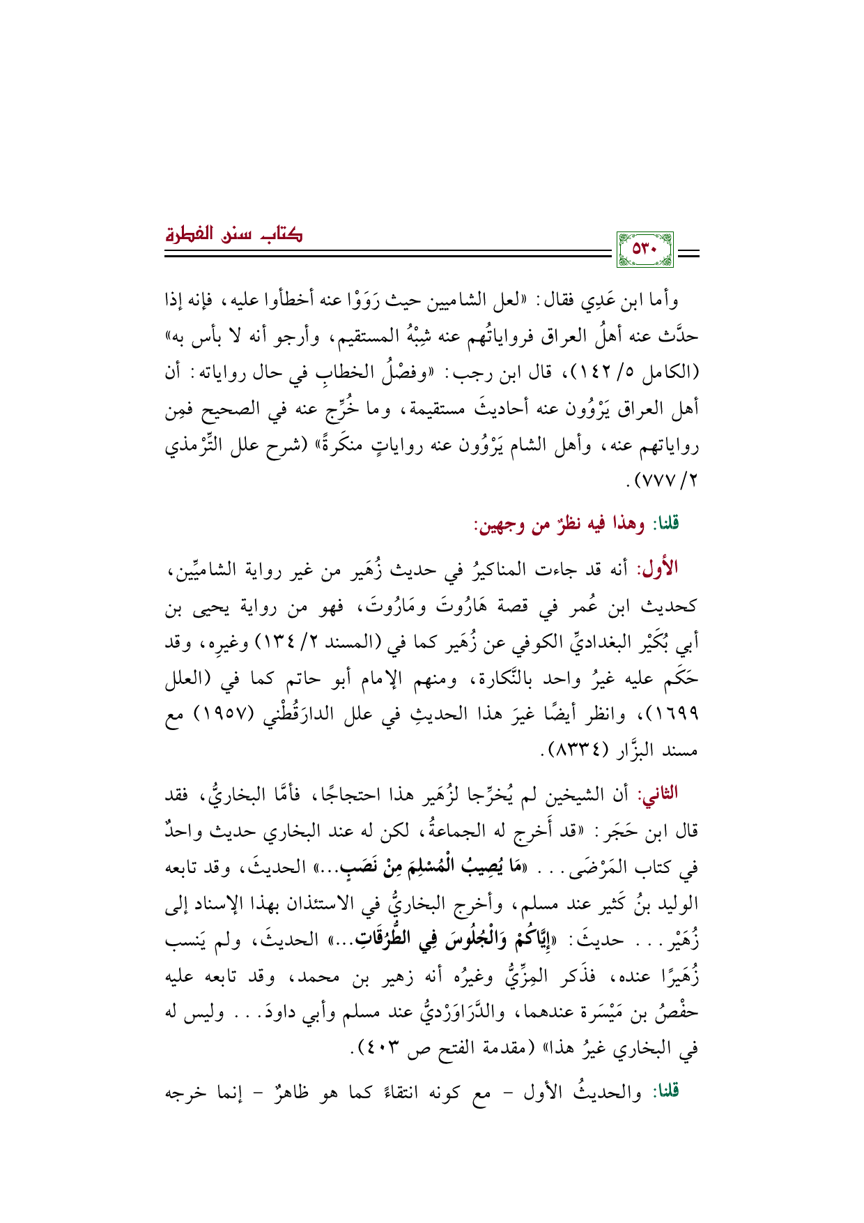 الأول: أنه قد جاءت المناكيرُ في حديث زُهَير من غير رواية الشاميِّين، كحديث ابن عُمر في قصة هَارُوتَ ومَارُوتَ، فهو من رواية يحيى بن أبي بُكَيْر البغداديِّ الكوفي عن زُهَير كما في (المسند ٢/ ١٣٤) وغيرِه، وقد حَكَم عليه غيرُ واحد بالنَّكارة، ومنهم الإمام أبو حاتم كما في (العلل ١٦٩٩)، وانظر أيضًا غيرَ هذا الحديثِ في علل الدارَقُطْني (١٩٥٧) مع مسند البزَّار (٨٣٣٤).