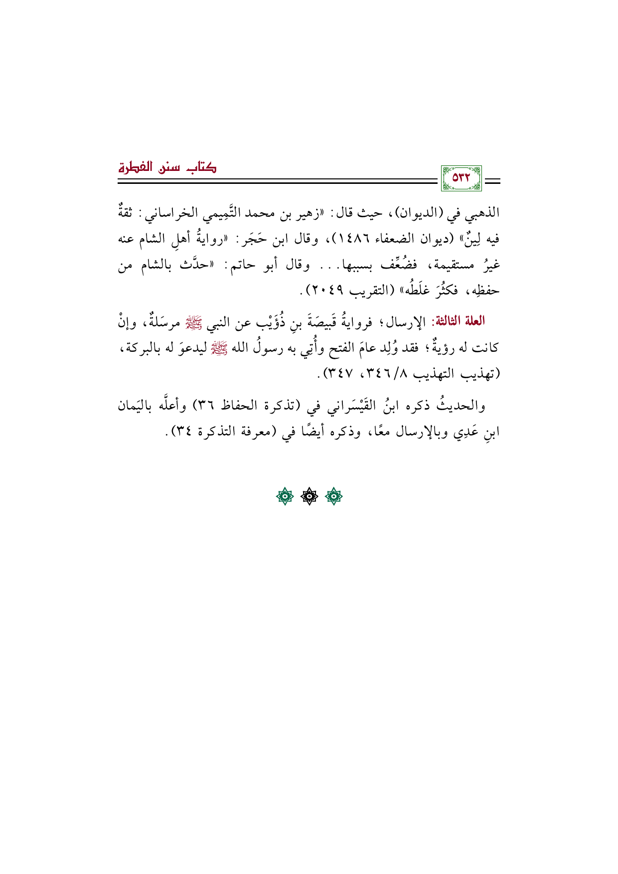العلة الثالثة: الإرسال؛ فروايةُ قَبيصَةَ بنِ ذُؤَيْب عن النبي صلى الله عليه وسلم مرسَلةٌ، وإنْ كانت له رؤيةٌ؛ فقد وُلِد عامَ الفتح وأُتِي به رسولُ الله صلى الله عليه وسلم ليدعوَ له بالبركة، (تهذيب التهذيب ٨/ ٣٤٦، ٣٤٧).