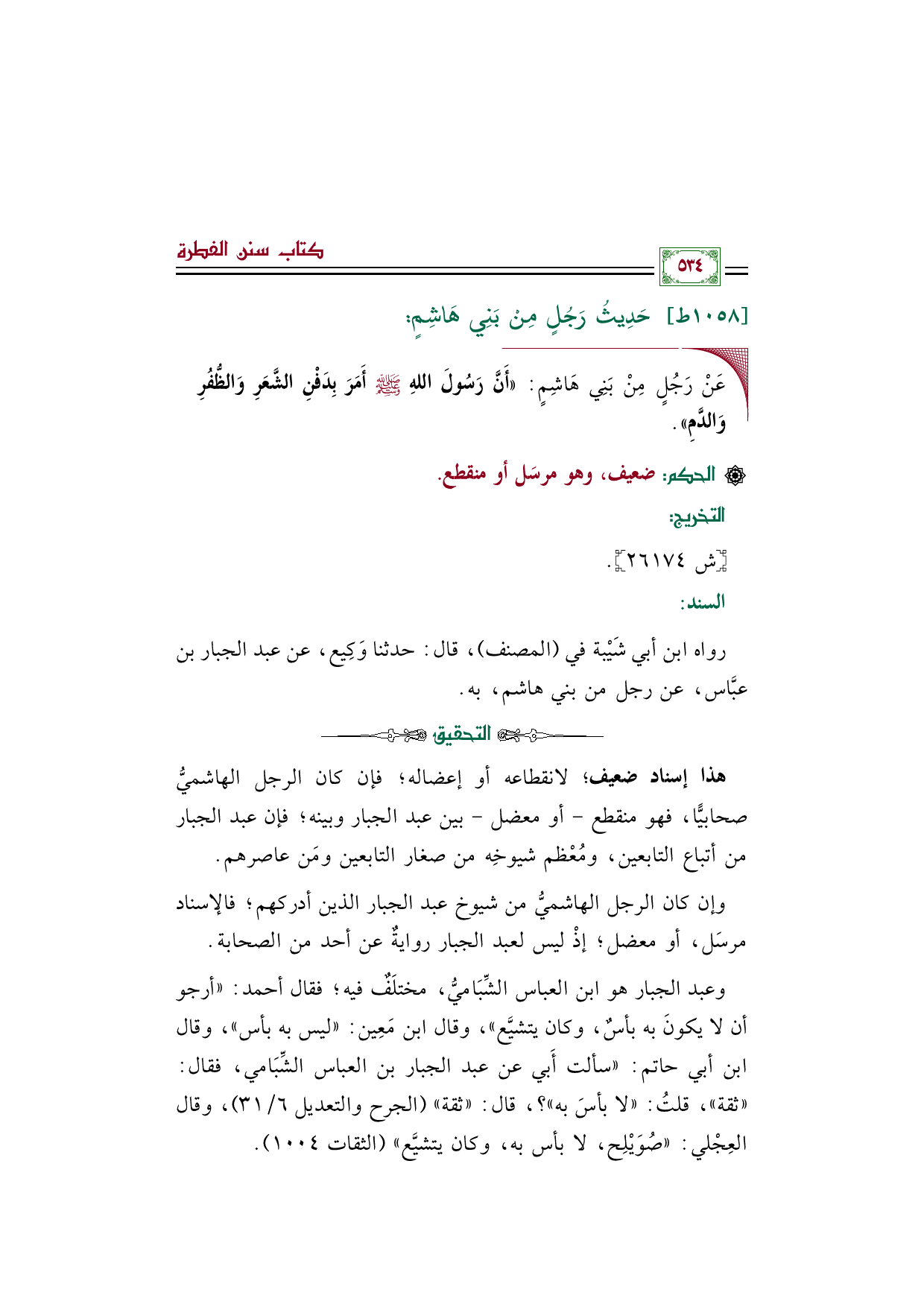 رواه ابن أبي شَيْبة في (المصنف)، قال: حدثنا وَكِيع، عن عبد الجبار بن عبَّاس، عن رجل من بني هاشم، به.