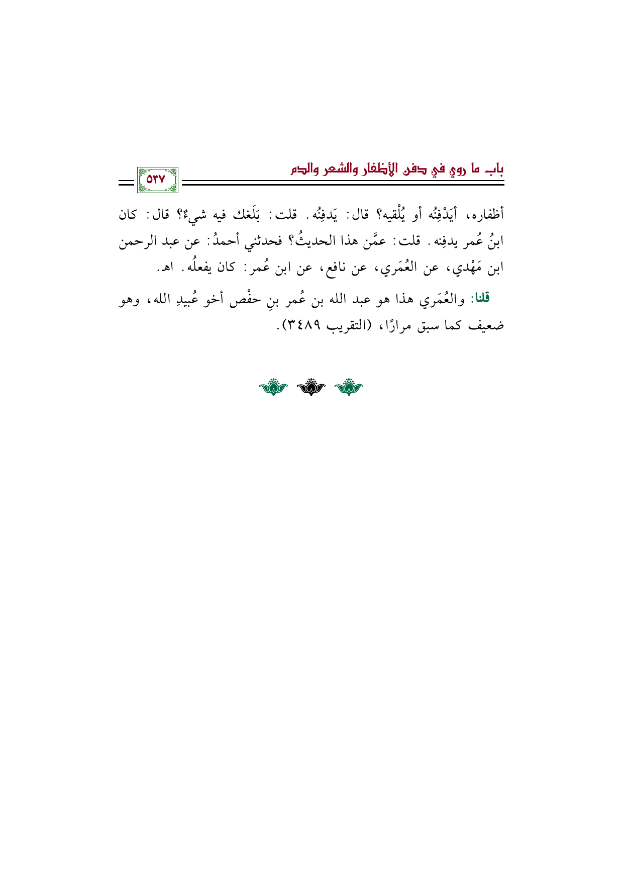 أظفاره، أيَدْفِنُه أو يُلْقيه؟ قال: يَدفِنُه. قلت: بَلَغك فيه شيءٌ؟ قال: كان ابنُ عُمر يدفِنه. قلت: عمَّن هذا الحديثُ؟ فحدثني أحمدُ: عن عبد الرحمن بن مَهْدي، عن العُمَري، عن نافع، عن ابن عُمر: كان يفعلُه. اهـ.