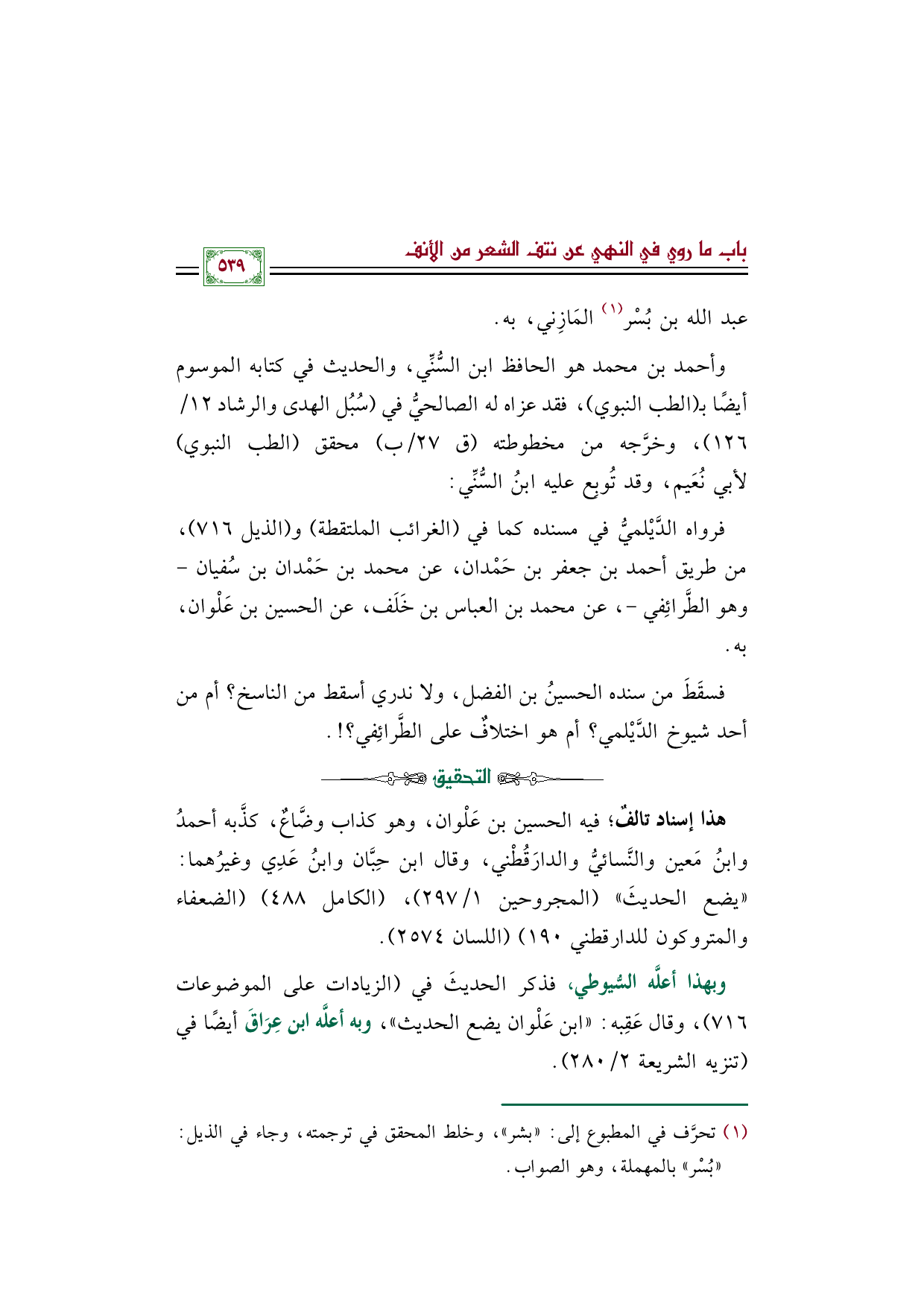 فسقَطَ من سنده الحسينُ بن الفضل، ولا ندري أسقط من الناسخ؟ أم من أحد شيوخ الدَّيْلمي؟ أم هو اختلافٌ على الطَّرائِفي؟ ! .