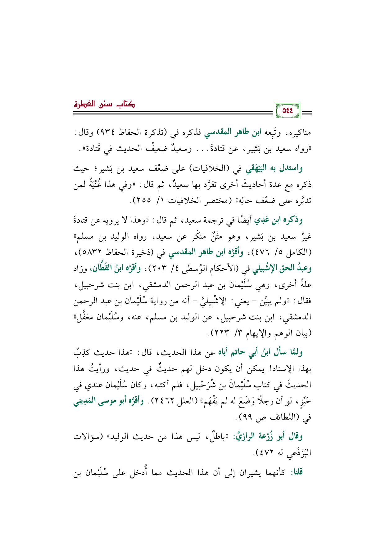 وذكره ابن عَدِي أيضًا في ترجمة سعيد، ثم قال: "وهذا لا يرويه عن قتادةَ غيرُ سعيد بن بَشير، وهو متْنٌ منكَر عن سعيد، رواه الوليد بن مسلم" (الكامل ٥/ ٤٧٦)، وأقرَّه ابن طاهر المقدسي في (ذخيرة الحفاظ ٥٨٣٢)، وعبدُ الحق الإشْبيلي في (الأحكام الوُسطى ٤/ ٢٠٣)، وأقرَّه ابنُ القَطَّان، وزاد علةً أخرى، وهي سُلَيْمان بن عبد الرحمن الدمشقي، ابن بنت شرحبيل، فقال: "ولم يبيِّن - يعني: الإشْبيليَّ- أنه من رواية سُلَيْمان بن عبد الرحمن الدمشقي، ابن بنت شرحبيل، عن الوليد بن مسلم، عنه، وسُلَيْمان مغفَّل" (بيان الوهم والإيهام ٣/ ٢٢٣).