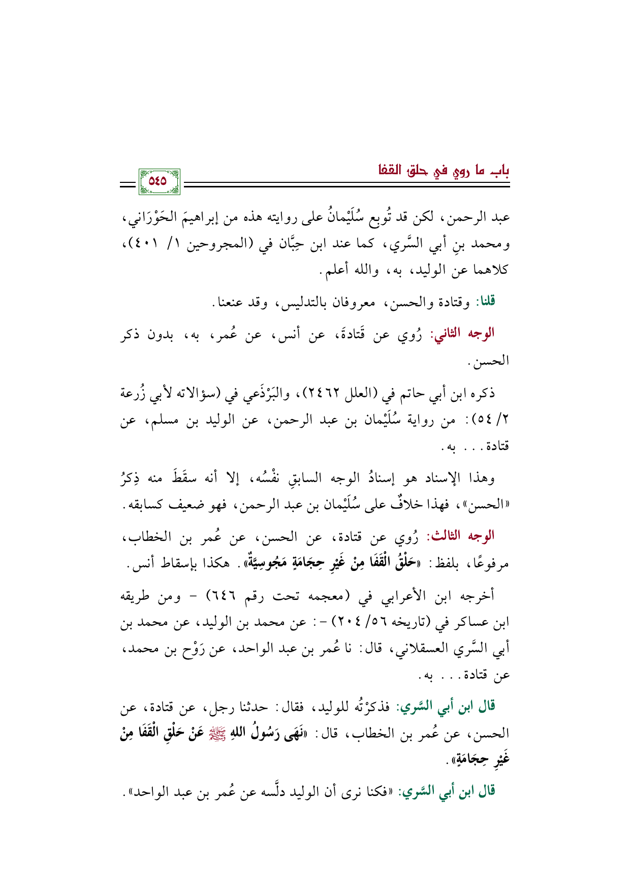 قال ابن أبي السَّري: فذكرْتُه للوليد، فقال: حدثنا رجل، عن قتادة، عن الحسن، عن عُمر بن الخطاب، قال: ((نَهَى رَسُولُ اللهِ صَلَّى اللهُ عَلَيْهِ وَسَلَّمَ عَنْ حَلْقِ الْقَفَا مِنْ غَيْرِ حِجَامَةٍ)).