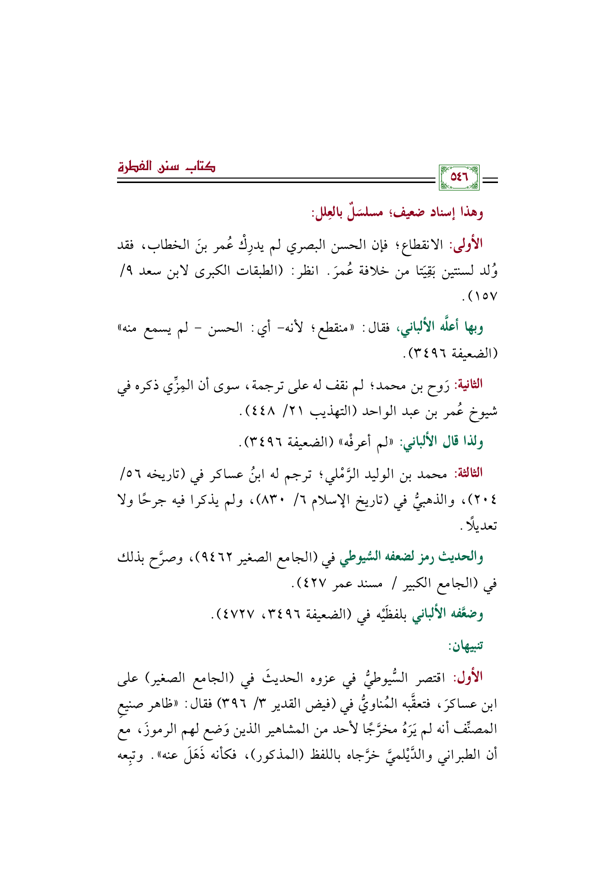 الأولى: الانقطاع؛ فإن الحسن البصري لم يدرِكْ عُمر بنَ الخطاب، فقد وُلد لسنتين بَقِيَتا من خلافة عُمرَ. انظر (الطبقات الكبرى لابن سعد ٩/ ١٥٧).
