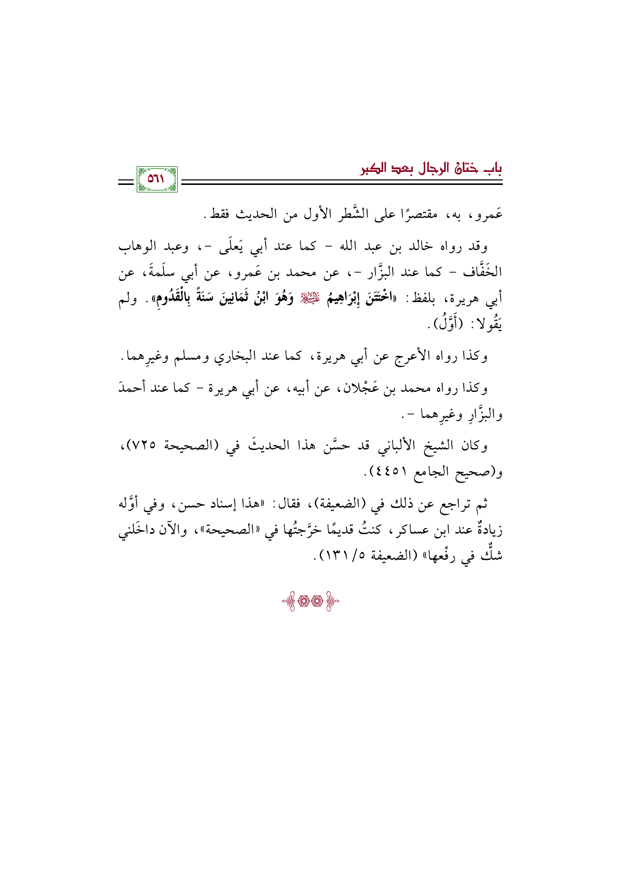 وقد رواه خالد بن عبد الله- كما عند أبي يَعلَى-، وعبد الوهاب الخَفَّاف- كما عند البزَّار-، عن محمد بن عَمرو، عن أبي سلَمةَ، عن أبي هريرة، بلفظ: ((اخْتَتَنَ إِبْرَاهِيمُ عَلَيْهِ السَّلَامُ وَهُوَ ابْنُ ثَمَانِينَ سَنَةً بِالْقَدُومِ)). ولم يَقُولا: (أَوَّلُ).