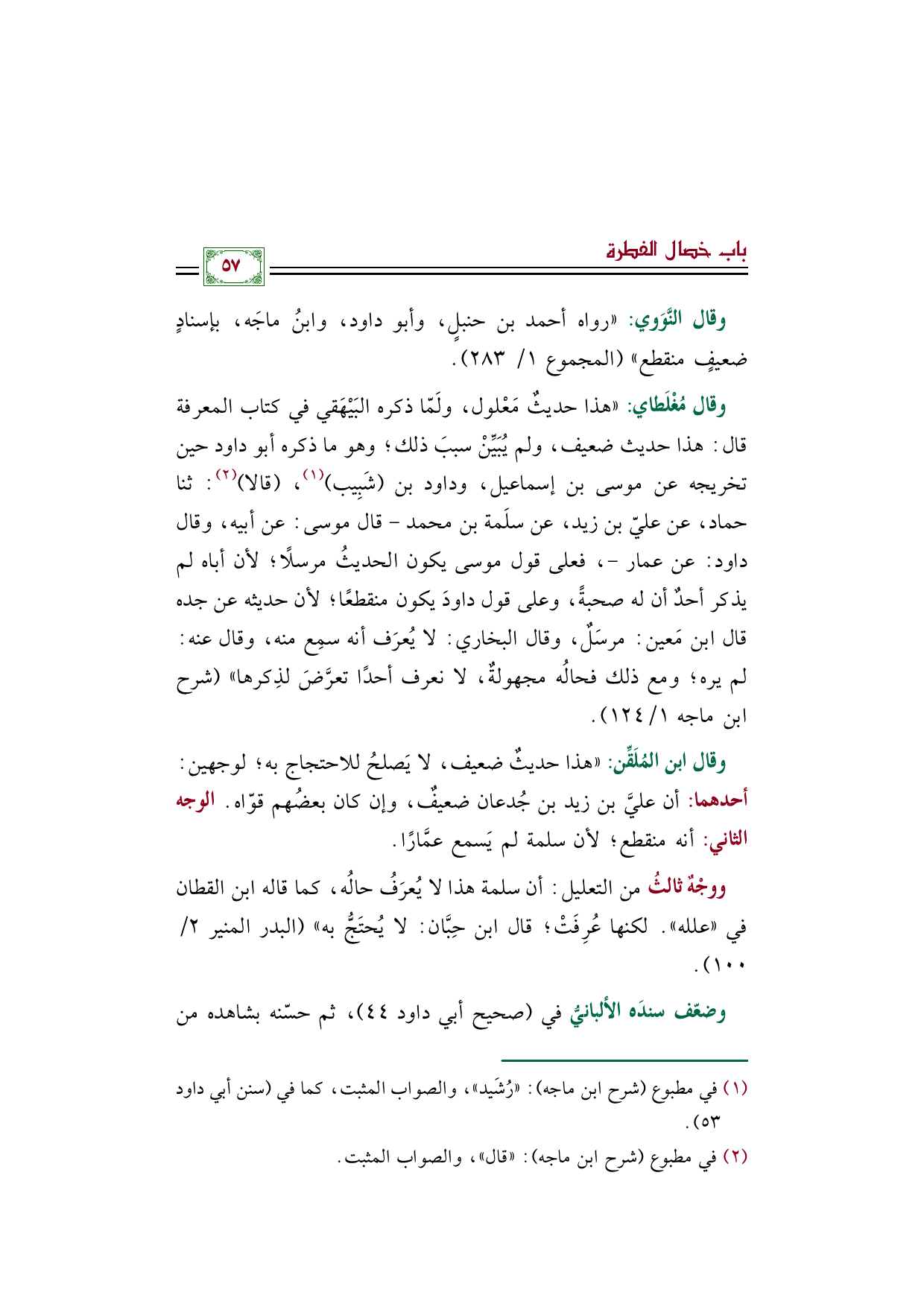وقال مُغْلَطاي: "هذا حديثٌ مَعْلول، ولَمّا ذكره البَيْهَقي في كتاب المعرفة قال: هذا حديث ضعيف، ولم يُبَيِّنْ سببَ ذلك؛ وهو ما ذكره أبو داود حين تخريجه عن موسى بن إسماعيل، وداود بن (شَبِيب) (¬١)، (قالا) (¬٢): ثنا حماد، عن عليّ بن زيد، عن سلَمة بن محمد- قال موسى: عن أبيه، وقال داود: عن عمار-، فعلى قول موسى يكون الحديثُ مرسلًا؛ لأن أباه لم يذكر أحدٌ أن له صحبةً، وعلى قول داودَ يكون منقطعًا؛ لأن حديثه عن جده قال ابن مَعين: مرسَلٌ، وقال البخاري: لا يُعرَف أنه سمِع منه، وقال عنه: لم يره؛ ومع ذلك فحالُه مجهولةٌ، لا نعرف أحدًا تعرَّضَ لذِكرها" (شرح ابن ماجه ١/ ١٢٤).