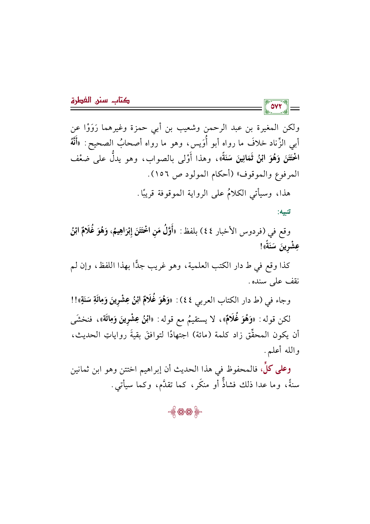 ولكن المغيرة بن عبد الرحمن وشعيب بن أبي حمزة وغيرهما رَوَوْا عن أبي الزِّناد خلافَ ما رواه أبو أُوَيس، وهو ما رواه أصحابُ الصحيح: ((أَنَّهُ اخْتَتَنَ وَهُوَ ابْنُ ثَمَانِينَ سَنَةً))، وهذا أَوْلى بالصواب، وهو يدلُّ على ضعْف المرفوع والموقوف" (أحكام المولود ص ١٥٦).