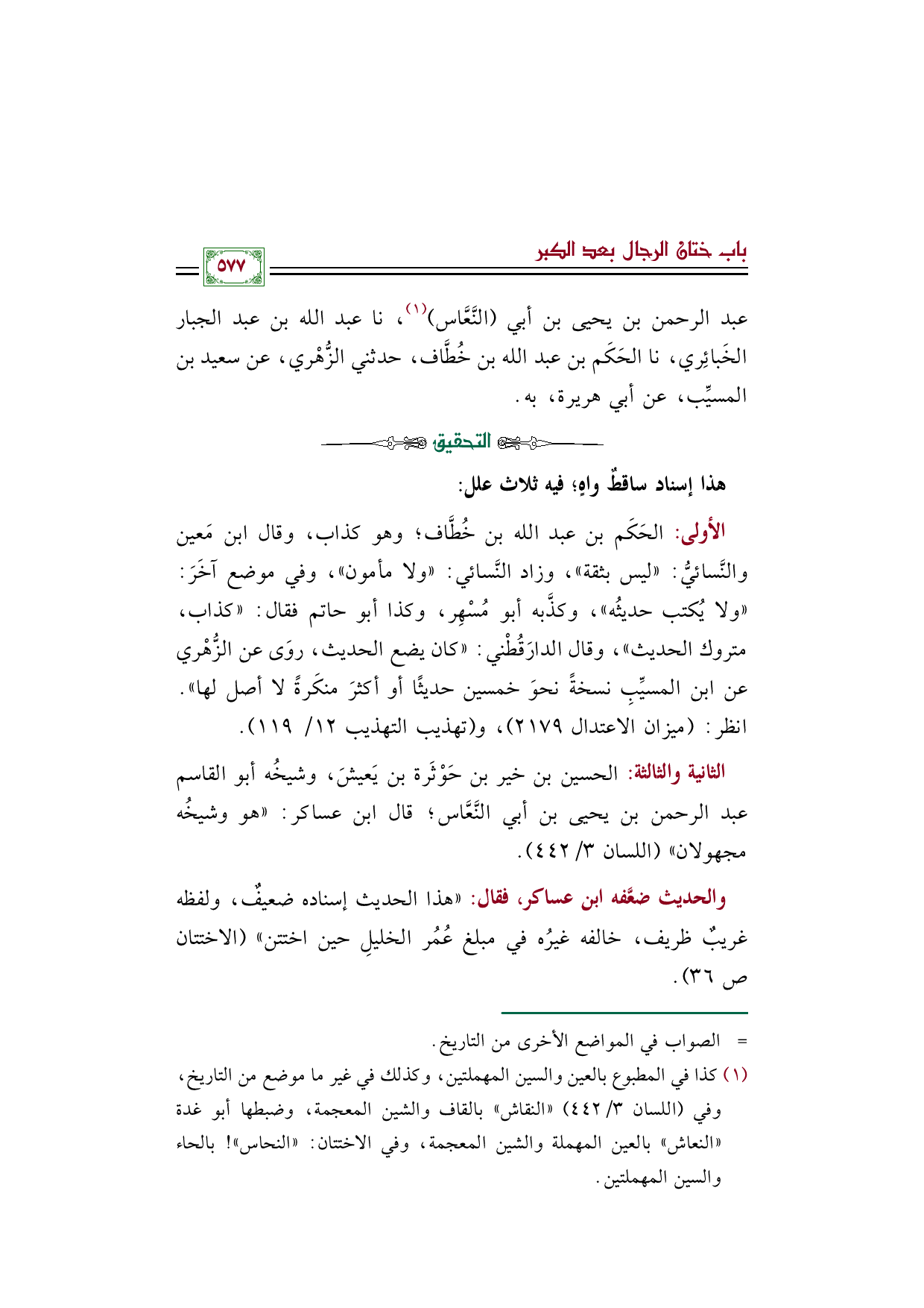 عبد الرحمن بن يحيى بن أبي (النَّعَّاس) (¬١)، نا عبد الله بن عبد الجبار الخَبائِري، نا الحَكَم بن عبد الله بن خُطَّاف، حدثني الزُّهْري، عن سعيد بن المسيِّب، عن أبي هريرة، به.