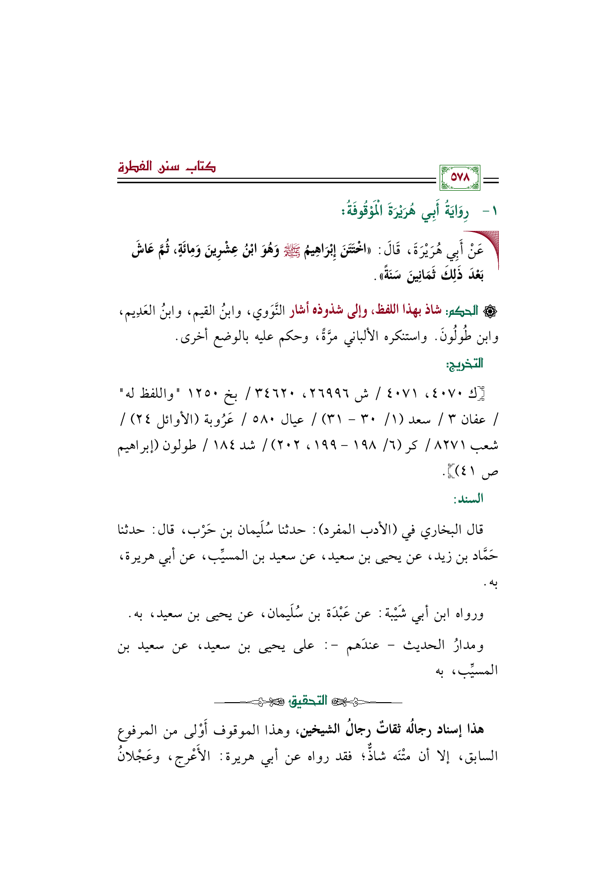هذا إسناد رجالُه ثقاتٌ رجالُ الشيخين، وهذا الموقوف أَوْلى من المرفوع السابق، إلا أن متْنَه شاذٌّ؛ فقد رواه عن أبي هريرة: الأَعْرج، وعَجْلانُ