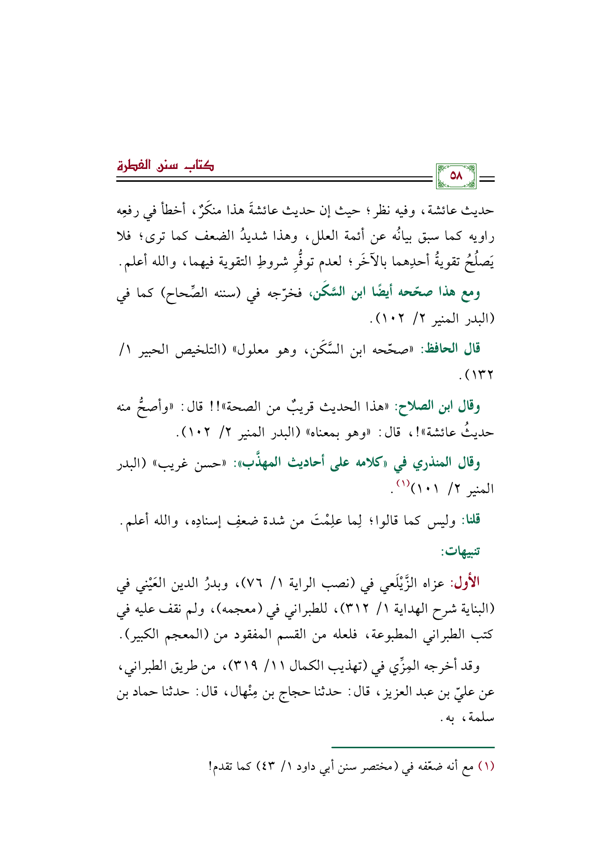 وقال ابن الصلاح: "هذا الحديث قريبٌ من الصحة"!! قال: "وأصحُّ منه حديثُ عائشة"!، قال: "وهو بمعناه" (البدر المنير ٢/ ١٠٢).