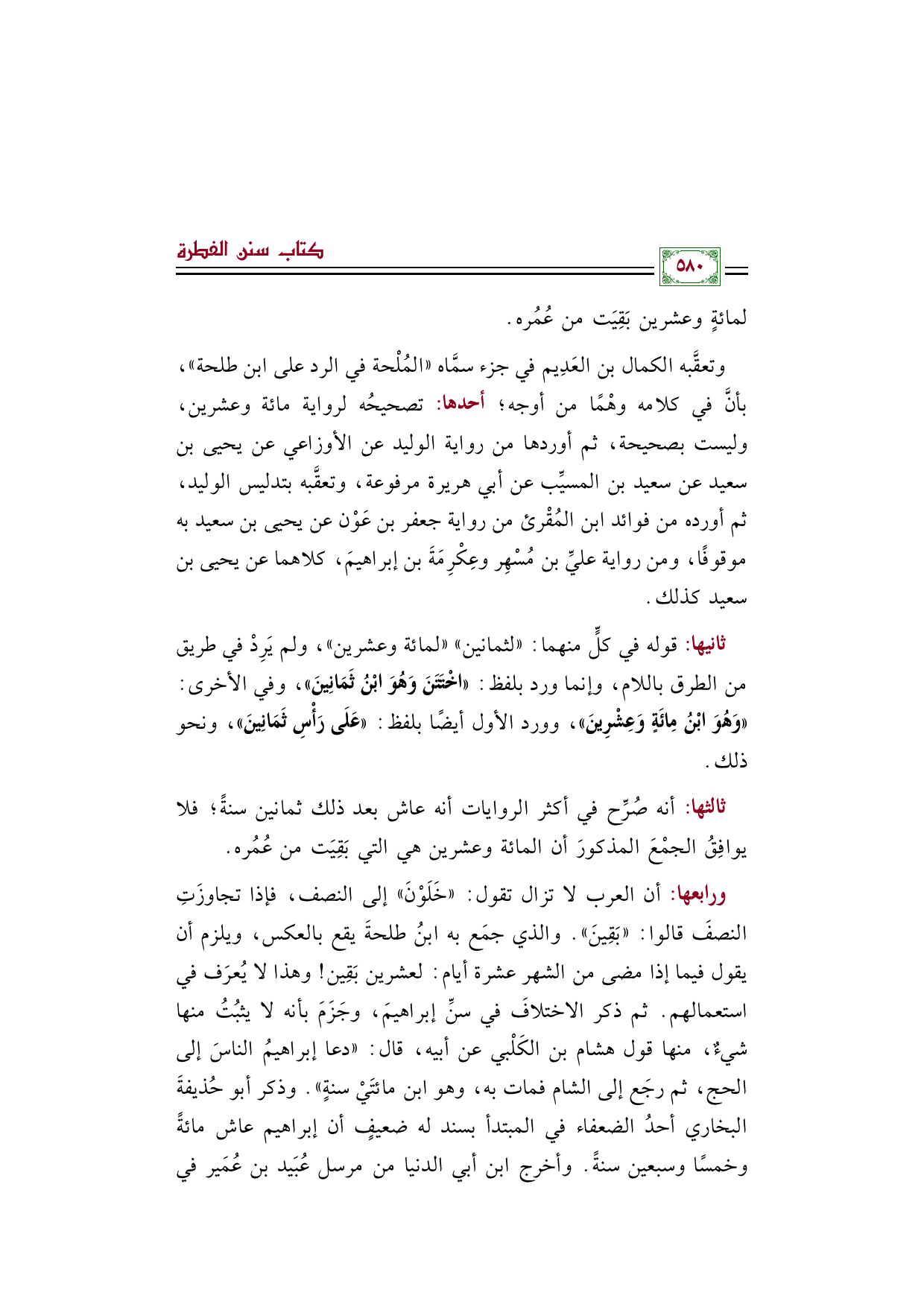 ورابعها: أن العرب لا تزال تقول: "خَلَوْنَ" إلى النصف، فإذا تجاوزَتِ النصفَ قالوا: "بَقِينَ". والذي جمَع به ابنُ طلحةَ يقع بالعكس، ويلزم أن يقول فيما إذا مضى من الشهر عشرة أيام: لعشرين بَقِين! وهذا لا يُعرَف في استعمالهم. ثم ذكر الاختلافَ في سنِّ إبراهيمَ، وجَزَمَ بأنه لا يثبُتُ منها شيءٌ، منها قول هشام بن الكَلْبي عن أبيه، قال: ((دعا إبراهيمُ الناسَ إلى الحج، ثم رجَع إلى الشام فمات به، وهو ابن مائتَيْ سنةٍ)). وذكر أبو حُذيفةَ البخاري أحدُ الضعفاء في المبتدأ بسند له ضعيفٍ أن إبراهيم عاش مائةً وخمسًا وسبعين سنةً. وأخرج ابن أبي الدنيا من مرسل عُبَيد بن عُمَير في