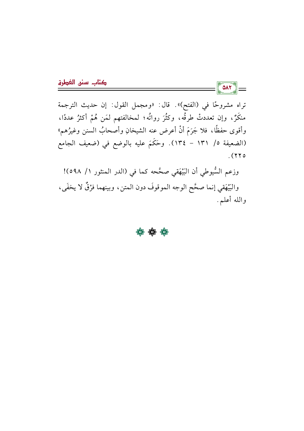 تراه مشروحًا في (الفتح) ". قال: "ومجمل القول: إن حديث الترجمة منكَرٌ، وإن تعددتْ طرقُه، وكثُرَ رواتُه؛ لمخالفتهم لمَن هُمْ أكثرُ عددًا، وأقوى حفظًا، فلا جَرَمَ أنْ أعرض عنه الشيخانِ وأصحابُ السنن وغيرُهم" (الضعيفة ٥/ ١٣١ - ١٣٤). وحَكَمَ عليه بالوضع في (ضعيف الجامع ٢٢٥).