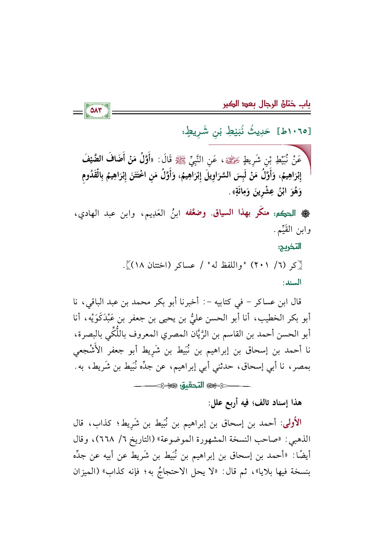 الأولى: أحمد بن إسحاق بن إبراهيم بن نُبَيط بن شَرِيط؛ كذاب، قال الذهبي: "صاحب النسخة المشهورة الموضوعة" (التاريخ ٦/ ٦٦٨)، وقال أيضًا: "أحمد بن إسحاق بن إبراهيم بن نُبَيط بن شَريط عن أبيه عن جدِّه بنسخة فيها بلايا"، ثم قال: "لا يحل الاحتجاجُ به؛ فإنه كذاب" (الميزان