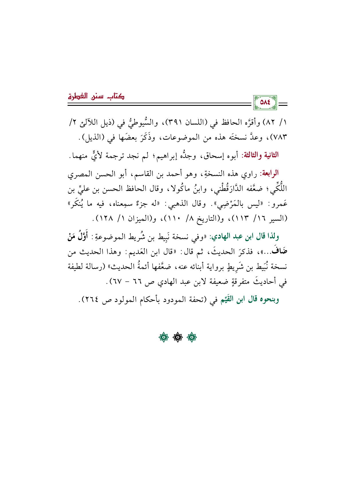 ولذا قال ابن عبد الهادي: "وفي نسخة نَبِيط بن شُريط الموضوعةِ: أَوَّلُ مَنْ ضَافَ ... "، فذكرَ الحديثَ، ثم قال: "قال ابن العَديم: وهذا الحديث من نسخة نُبَيط بن شَرِيطٍ برواية أبنائه عنه، ضعَّفها أئمةُ الحديث" (رسالة لطيفة في أحاديثَ متفرقةٍ ضعيفة لابن عبد الهادي ص ٦٦ - ٦٧).