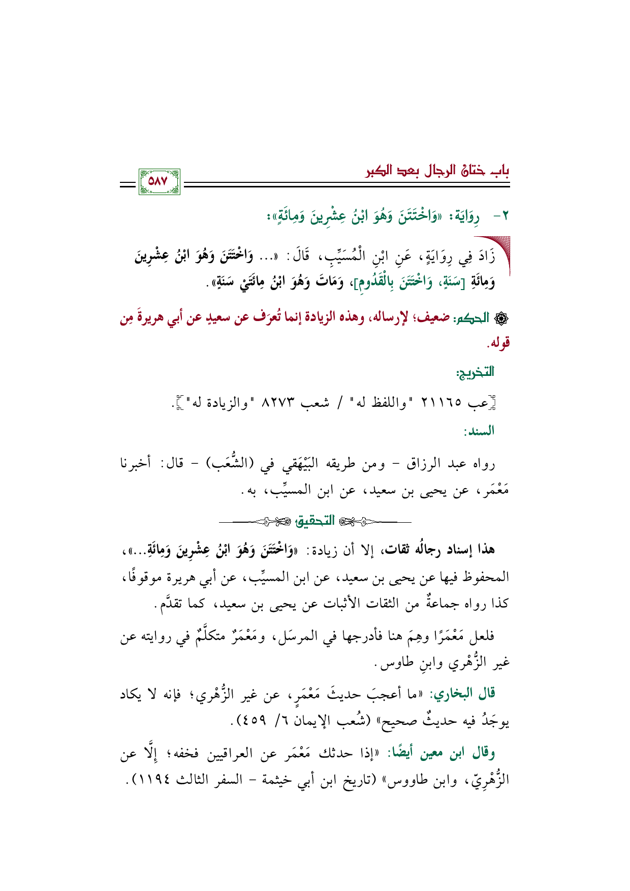رواه عبد الرزاق- ومن طريقه البَيْهَقي في (الشُّعَب) - قال: أخبرنا مَعْمَر، عن يحيى بن سعيد، عن ابن المسيِّب، به.