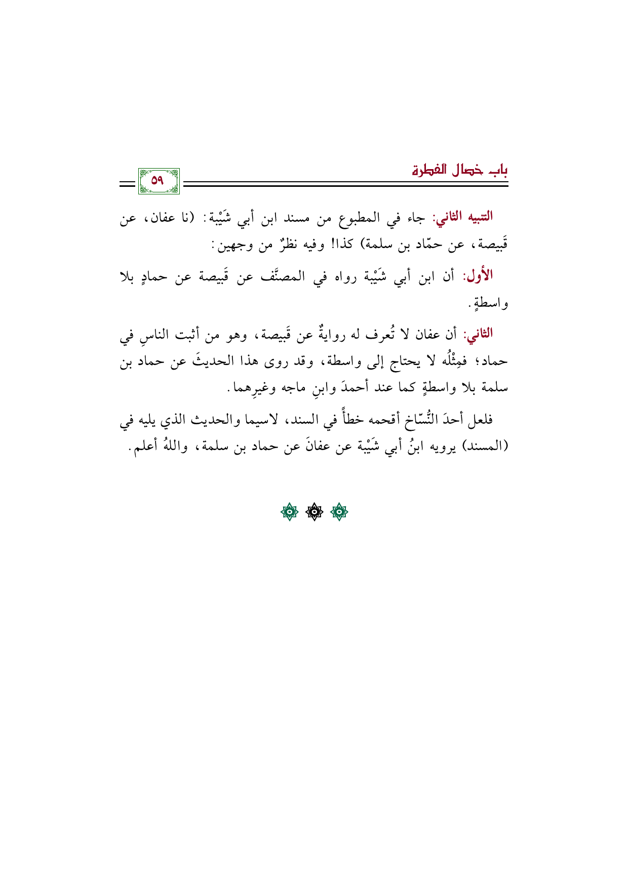 التنبيه الثاني: جاء في المطبوع من مسند ابن أبي شَيْبة: (نا عفان، عن قَبيصة، عن حمّاد بن سلمة) كذا! وفيه نظرٌ من وجهين: