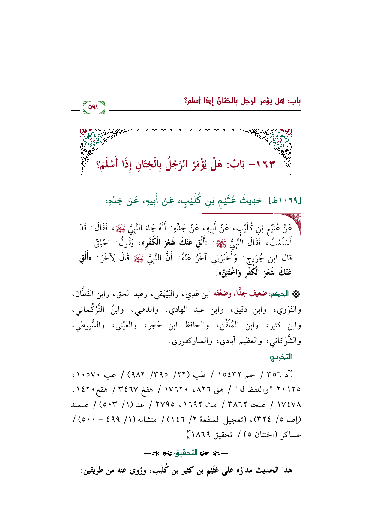 ◼ عَنْ عُثَيْمِ بْنِ كُلَيْبٍ, عَنْ أَبِيهِ، عَنْ جَدِّهِ: أَنَّهُ جَاءَ النَّبِيَّ صَلَّى اللهُ عَلَيْهِ وَسَلَّمَ, فَقَالَ: قَدْ أَسْلَمْتُ, فَقَالَ النَّبِيُّ صَلَّى اللهُ عَلَيْهِ وَسَلَّمَ: ((أَلْقِ عَنْكَ شَعْرَ الْكُفْرِ)) , يَقُولُ: احْلِقْ.
