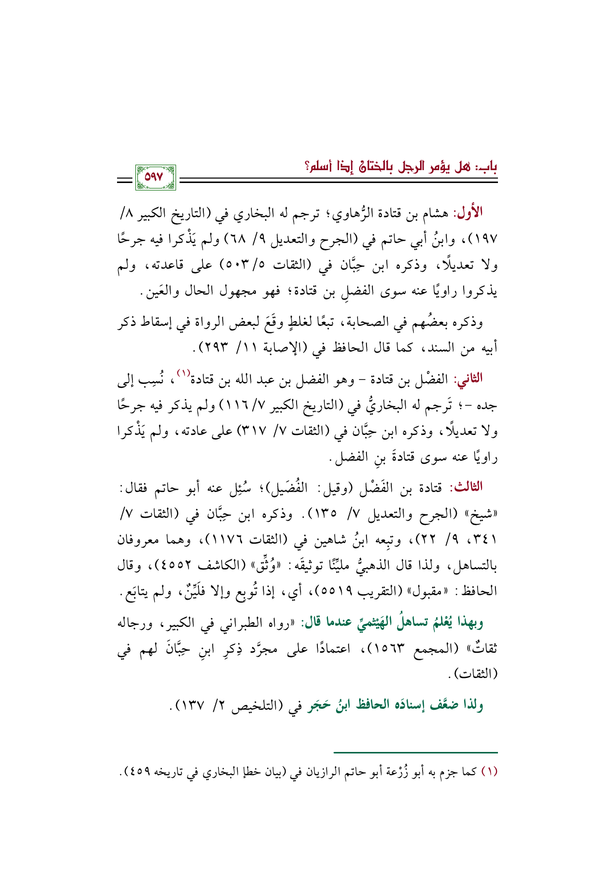 الثالث: قتادة بن الفَضْل (وقيل: الفُضَيل)؛ سُئِل عنه أبو حاتم فقال: "شيخ" (الجرح والتعديل ٧/ ١٣٥). وذكره ابن حِبَّان في (الثقات ٧/ ٣٤١، ٩/ ٢٢)، وتبِعه ابنُ شاهين في (الثقات ١١٧٦)، وهما معروفان بالتساهل، ولذا قال الذهبيُّ مليِّنًا توثيقَه: "وُثِّق" (الكاشف ٤٥٥٢)، وقال الحافظ: "مقبول" (التقريب ٥٥١٩)، أي، إذا تُوبِع وإلا فلَيِّنٌ، ولم يتابَع.