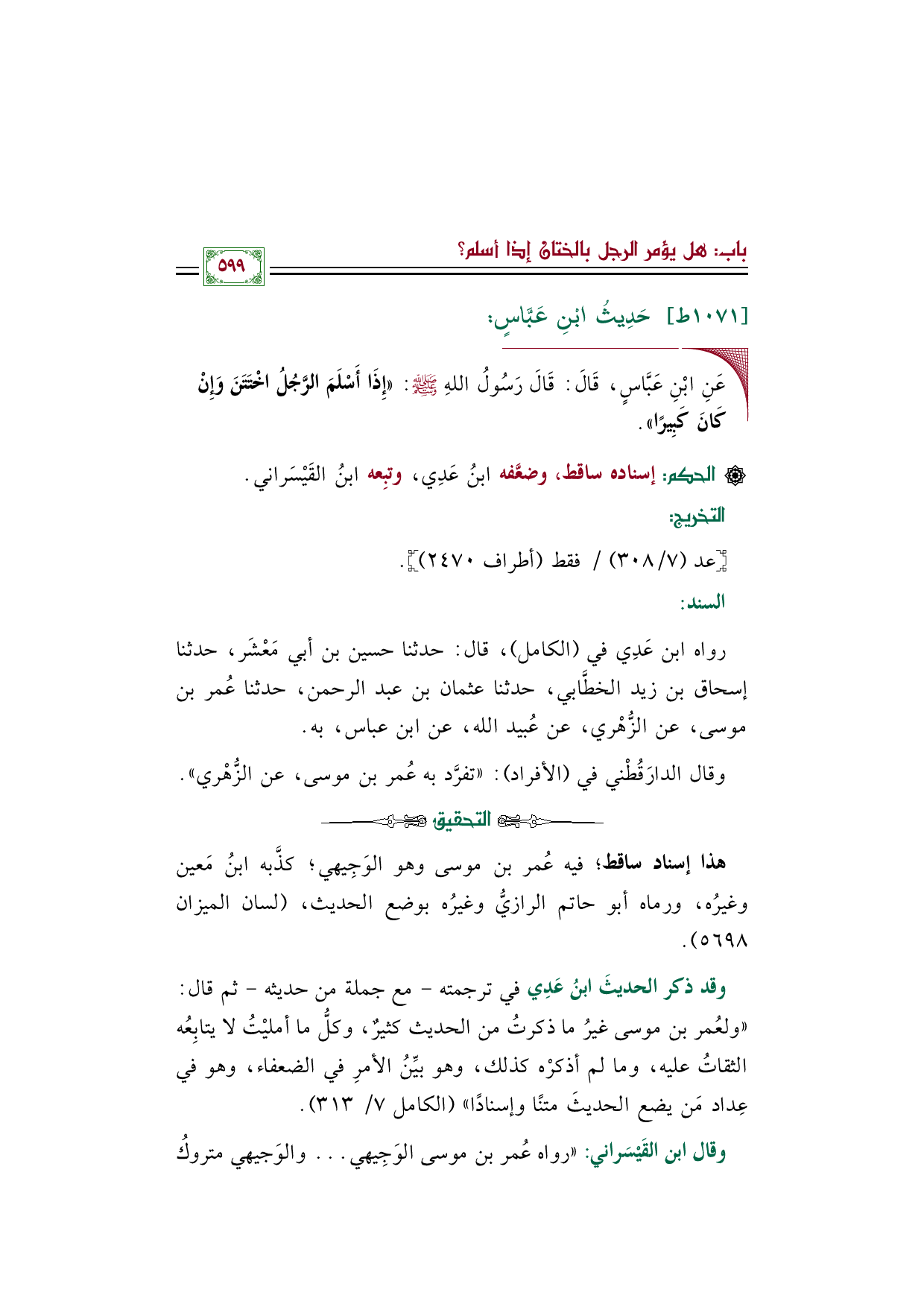 رواه ابن عَدِي في (الكامل)، قال: حدثنا حسين بن أبي مَعْشَر، حدثنا إسحاق بن زيد الخطَّابي، حدثنا عثمان بن عبد الرحمن، حدثنا عُمر بن موسى، عن الزُّهْري، عن عُبيد الله، عن ابن عباس، به.