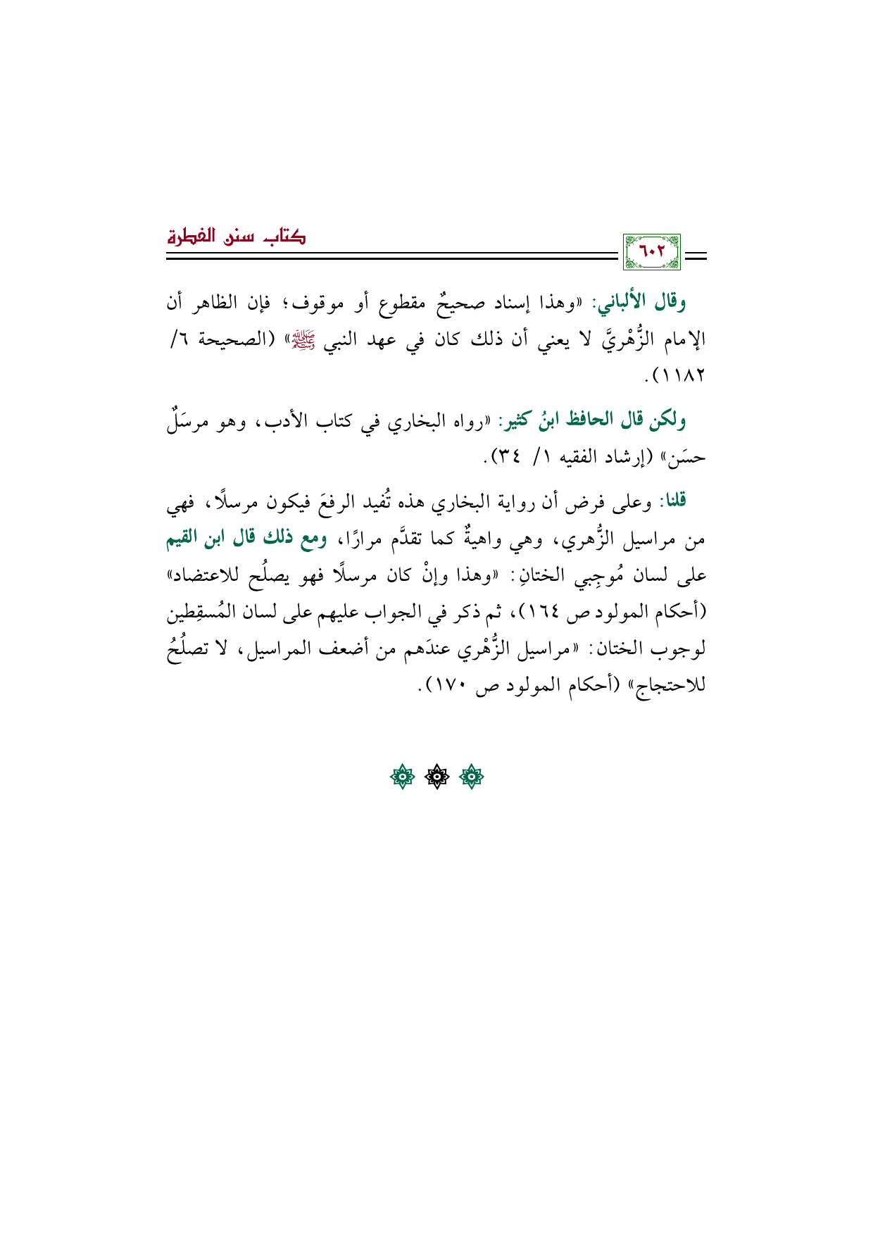 قلنا: وعلى فرض أن رواية البخاري هذه تُفيد الرفعَ فيكون مرسلًا، فهي من مراسيل الزُّهري، وهي واهيةٌ كما تقدَّم مرارًا، ومع ذلك قال ابن القيم على لسان مُوجِبي الختانِ: "وهذا وإنْ كان مرسلًا فهو يصلُح للاعتضاد" (أحكام المولود ص ١٦٤)، ثم ذكر في الجواب عليهم على لسان المُسقِطين لوجوب الختان: "مراسيل الزُّهْري عندَهم من أضعف المراسيل، لا تصلُحُ للاحتجاج" (أحكام المولود ص ١٧٠).