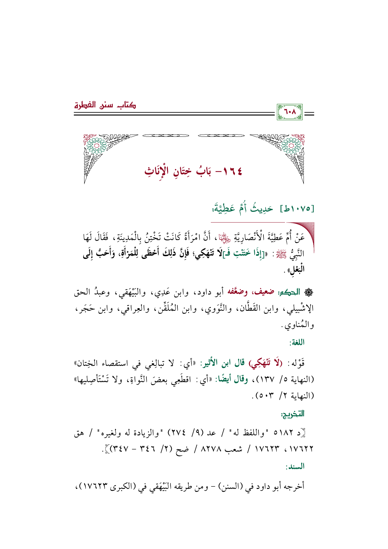 قَوْله: ((لَا تَنْهَكِي)) قال ابن الأثير: "أي: لا تبالِغي في استقصاء الخِتان" (النهاية ٥/ ١٣٧)، وقال أيضًا: "أي: اقطَعِي بعضَ النَّواةِ، ولا تَسْتَأصِليها" (النهاية ٢/ ٥٠٣).