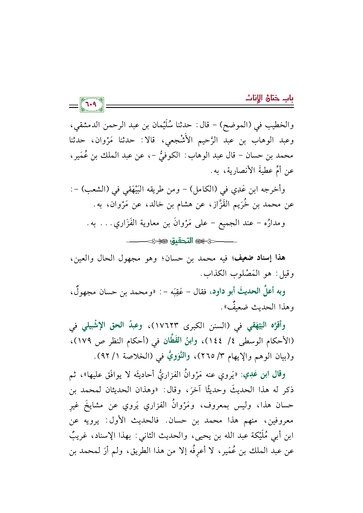وأخرجه ابن عَدِي في (الكامل) - ومن طريقه البَيْهَقي في (الشعب) -: عن محمد بن خُرَيم القَزَّاز، عن هشام بن خالد، عن مَرْوان، به.