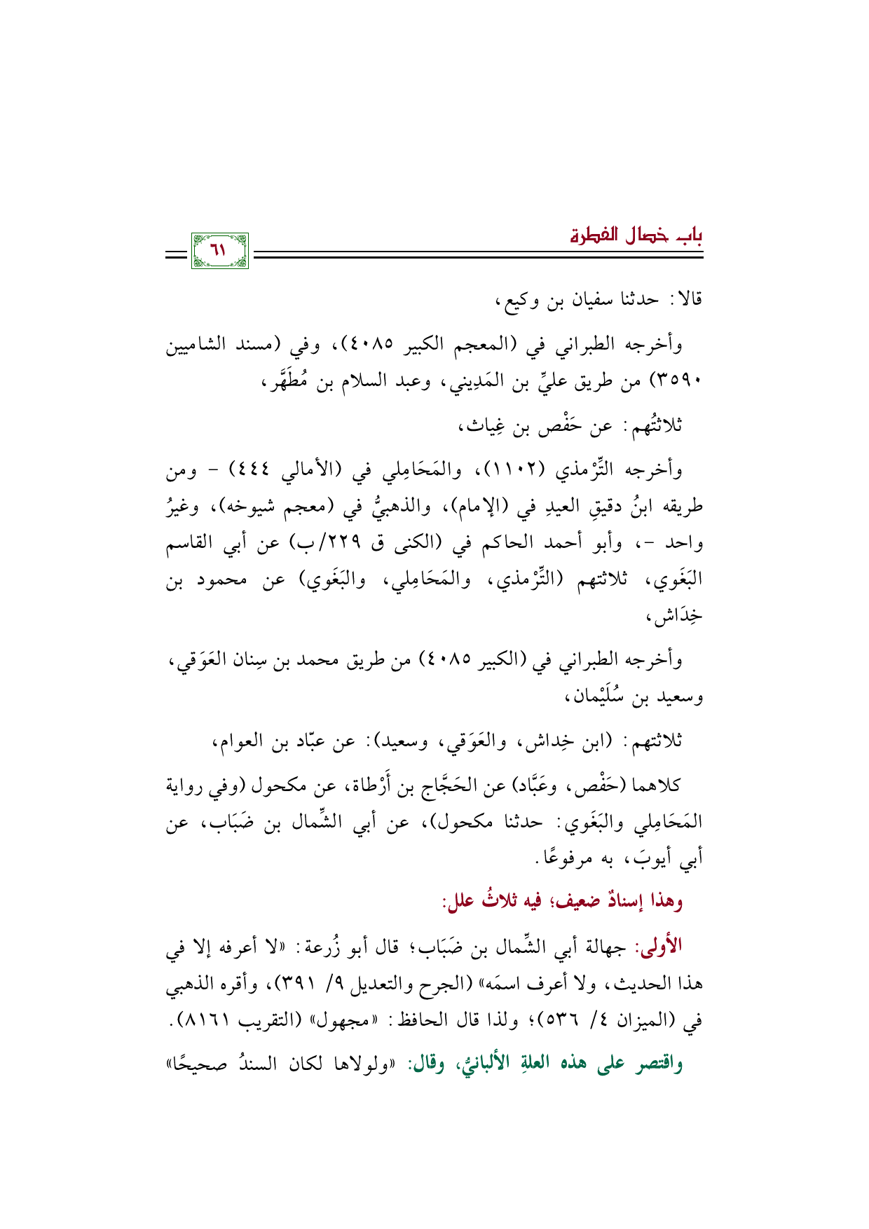 كلاهما (حَفْص، وعَبَّاد) عن الحَجَّاج بن أَرْطاة، عن مكحول (وفي رواية المَحَامِلي والبَغَوي: حدثنا مكحول)، عن أبي الشِّمال بن ضَبَاب، عن أبي أيوبَ، به مرفوعًا.