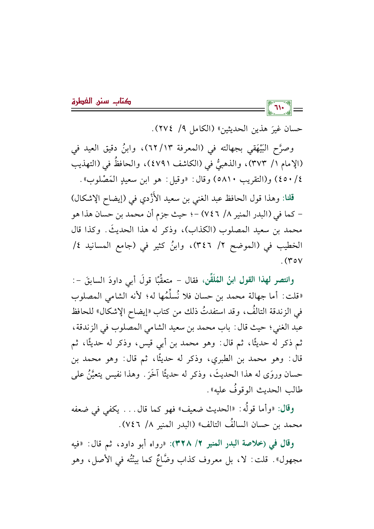 قلنا: وهذا قول الحافظ عبد الغني بن سعيد الأَزْدي في (إيضاح الإشكال) - كما في (البدر المنير ٨/ ٧٤٦) -؛ حيث جزم أن محمد بن حسان هذا هو محمد بن سعيد المصلوب (الكذاب)، وذكر له هذا الحديثَ. وكذا قال الخطيب في (الموضح ٢/ ٣٤٦)، وابنُ كثير في (جامع المسانيد ٤/ ٣٥٧).