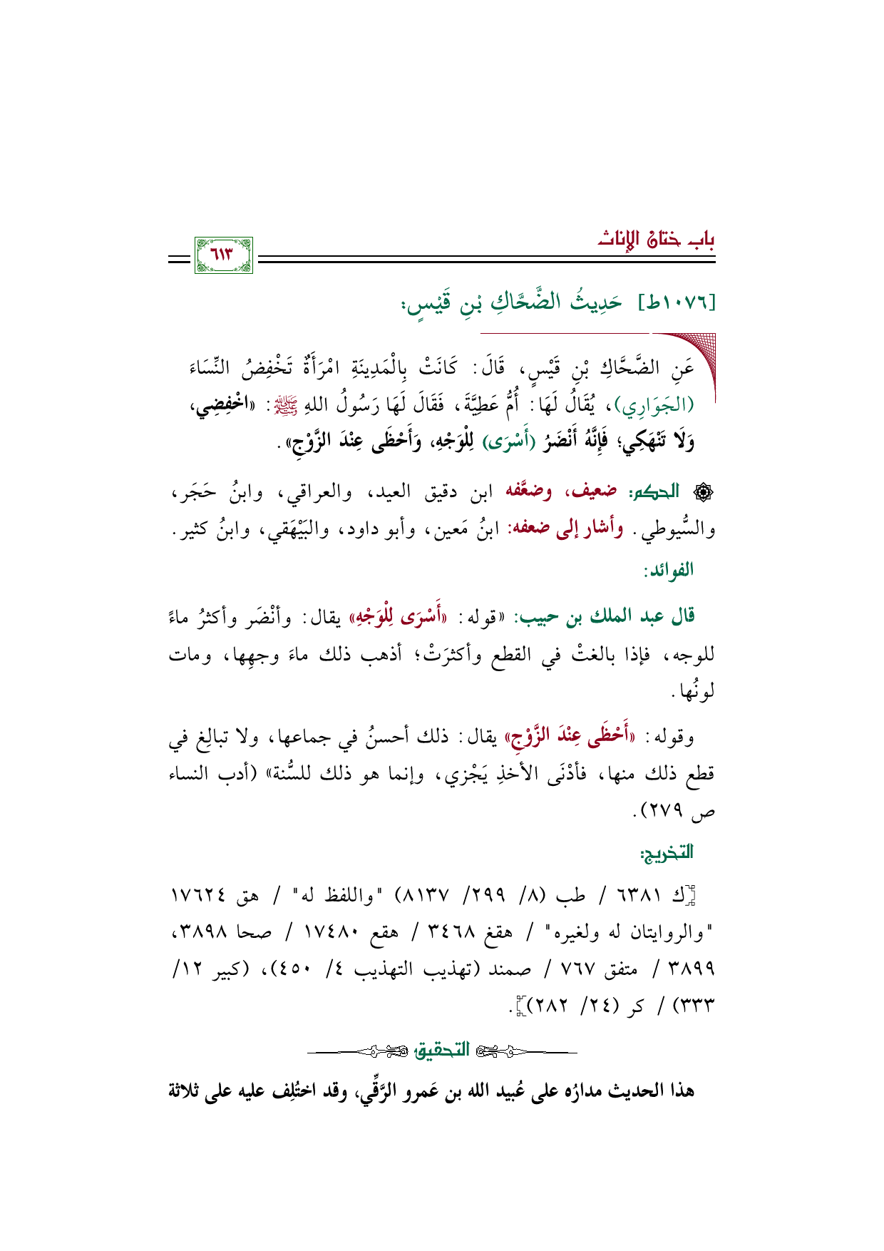 [الحكم]: ضعيف، وضعَّفه ابن دقيق العيد، والعراقي، وابنُ حَجَر، والسُّيوطي. وأشار إلى ضعفه: ابنُ مَعين، وأبو داود والبَيْهَقي، وابنُ كثير.