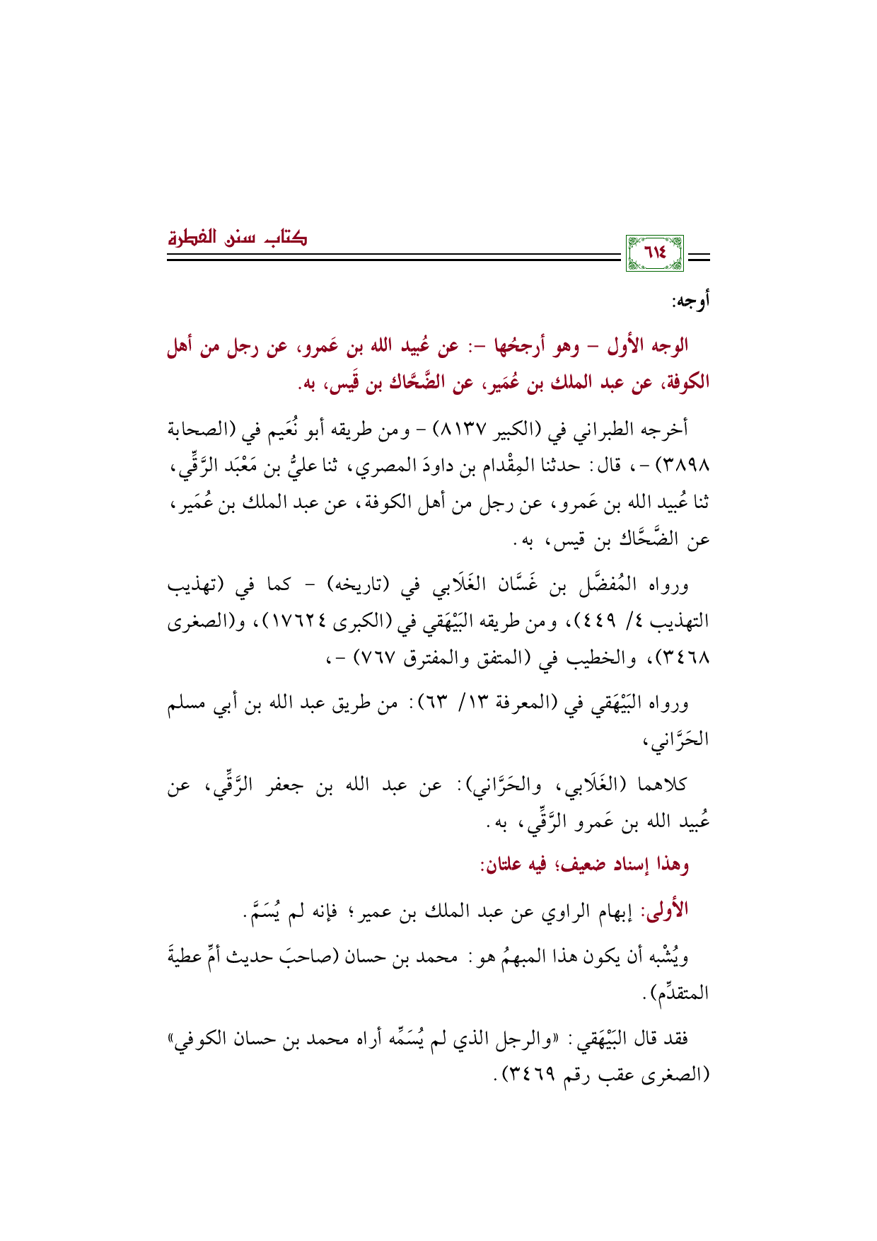الوجه الأول- وهو أرجحُها-: عن عُبيد الله بن عَمرو، عن رجل من أهل الكوفة، عن عبد الملك بن عُمَير، عن الضَّحَّاك بن قَيس، به.