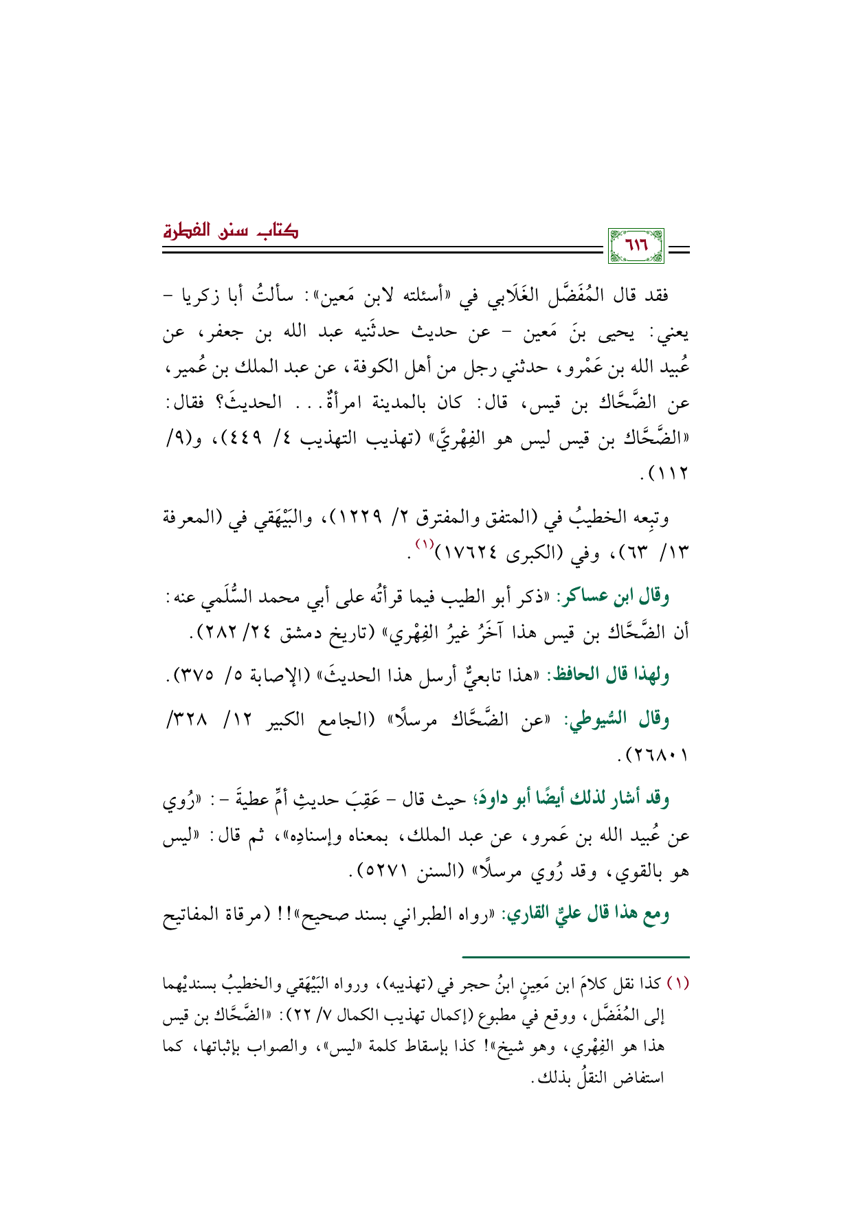 (¬١) كذا نقل كلامَ ابن مَعِينٍ ابنُ حجر في (تهذيبه)، ورواه البَيْهَقي والخطيبُ بسنديْهما إلى المُفَضَّل، ووقع في مطبوع (إكمال تهذيب الكمال ٧/ ٢٢): "الضَّحَّاك بن قيس هذا هو الفِهْري، وهو شيخ"! كذا بإسقاط كلمة "ليس"، والصواب بإثباتها، كما استفاض النقلُ بذلك.