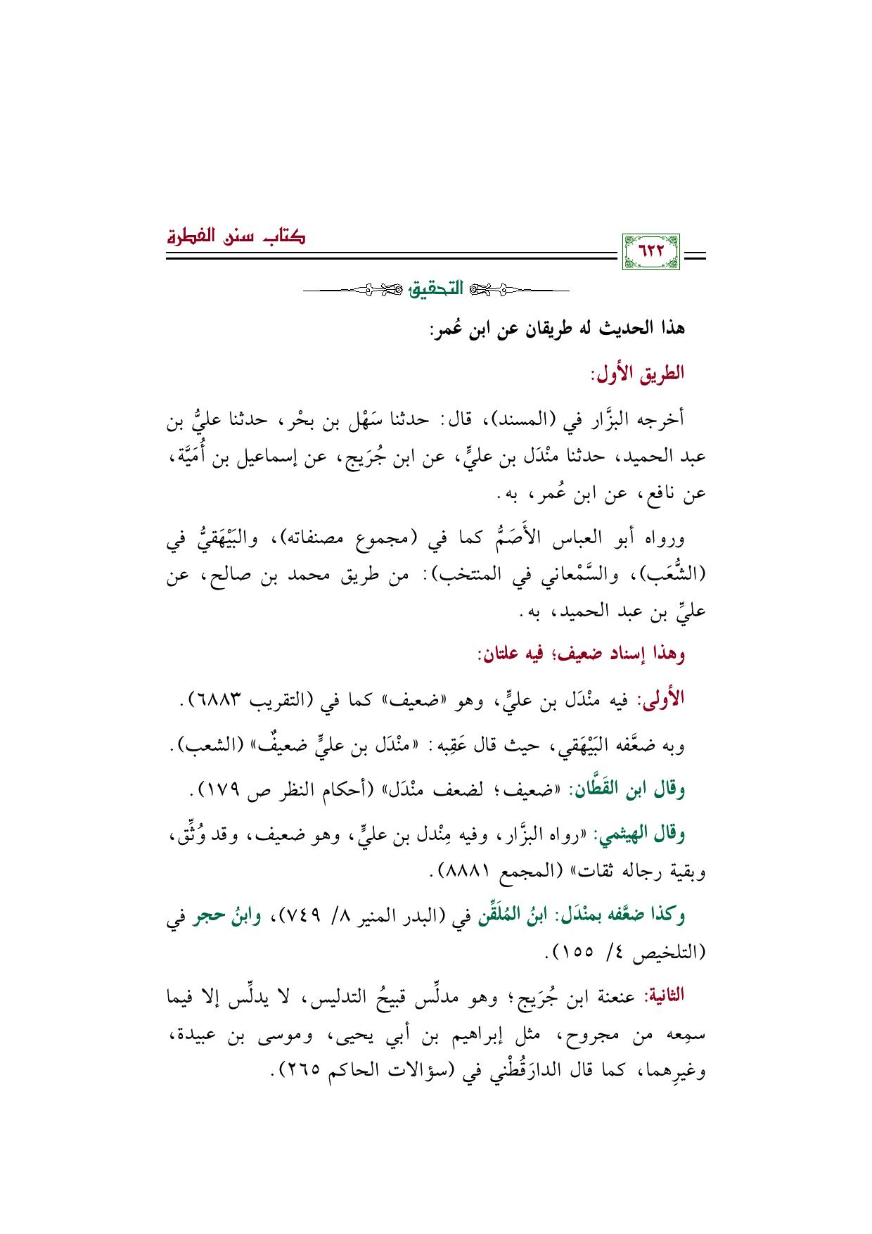 الثانية: عنعنة ابن جُرَيج؛ وهو مدلِّس قبيحُ التدليس، لا يدلِّس إلا فيما سمِعه من مجروح، مثل إبراهيم بن أبي يحيى، وموسى بن عبيدة، وغيرِهما، كما قال الدارَقُطْني في (سؤالات الحاكم ٢٦٥).