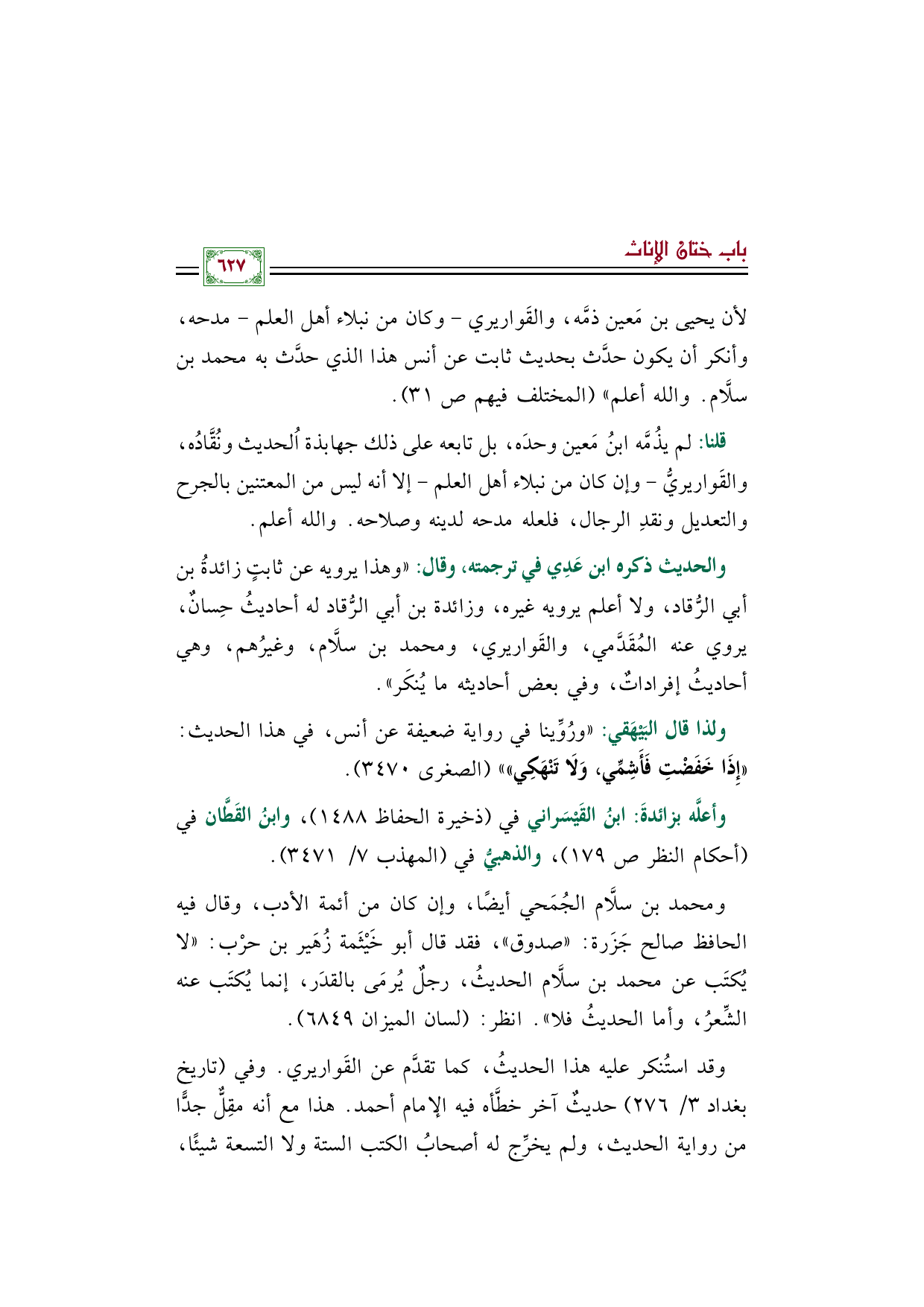ومحمد بن سلَّام الجُمَحي أيضًا، وإن كان من أئمة الأدب، وقال فيه الحافظ صالح جَزَرة: "صدوق"، فقد قال أبو خَيْثَمة زُهَير بن حرْب: "لا يُكتَب عن محمد بن سلَّام الحديثُ، رجلٌ يُرمَى بالقدَر، إنما يُكتَب عنه الشِّعرُ، وأما الحديثُ فلا". انظر (لسان الميزان ٦٨٤٩).