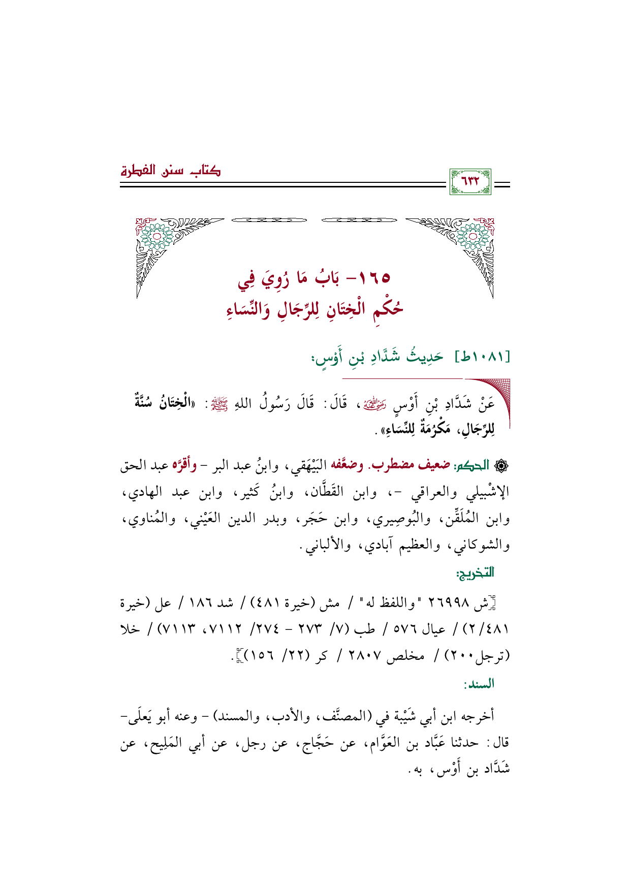 أخرجه ابن أبي شَيْبة في (المصنَّف، والأدب، والمسند) - وعنه أبو يَعلَى- قال: حدثنا عَبَّاد بن العَوَّام، عن حَجَّاج، عن رجل، عن أبي المَلِيح، عن شَدَّاد بن أَوْس، به.