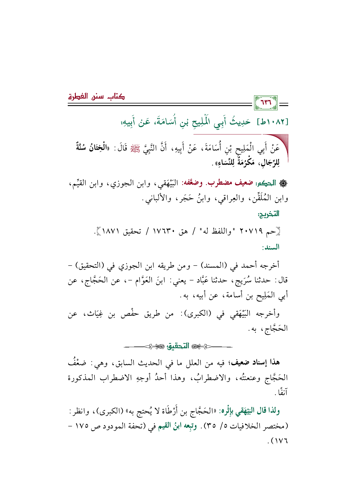 ولذا قال البَيْهَقي بإِثْره: "الحَجَّاج بن أَرْطَاة لا يُحتج به" (الكبرى)، وانظر (مختصر الخلافيات ٥/ ٣٥). وتبِعه ابنُ القيم في (تحفة المودود ص ١٧٥ - ١٧٦).