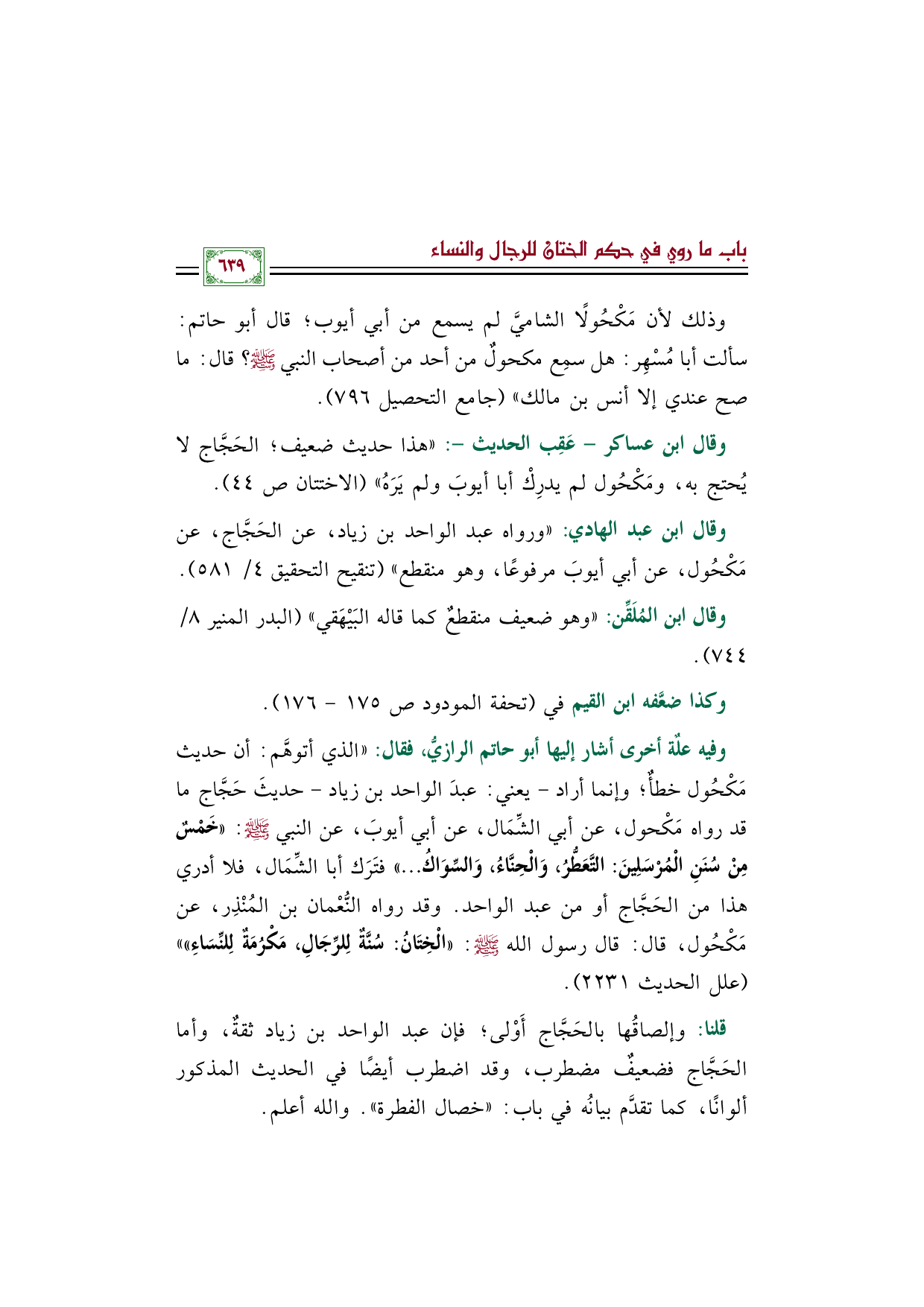 * وفيه علةٌ أخرى أشار إليها أبو حاتم الرازيُّ، فقال: "الذي أتوهَّم: أن حديث مَكْحُول خطأٌ؛ وإنما أراد - يعني: عبدَ الواحد بن زياد- حديثَ حَجَّاج ما قد رواه مَكْحول، عن أبي الشِّمَال، عن أبي أيوبَ، عن النبي صلى الله عليه وسلم: ((خَمْسٌ مِنْ سُنَنِ الْمُرْسَلِينَ: التَّعَطُّرُ، وَالْحِنَّاءُ، وَالسِّوَاكُ ... )) فتَرَك أبا الشِّمَال، فلا أدري هذا من الحَجَّاج أو من عبد الواحد. وقد رواه النُّعْمان بن المُنْذِر، عن مَكْحُول، قال: قال رسول الله صلى الله عليه وسلم: ((الْخِتَانُ: سُنَّةٌ لِلرِّجَالِ، مَكْرُمَةٌ لِلنِّسَاءِ)) " (علل الحديث ٢٢٣١).