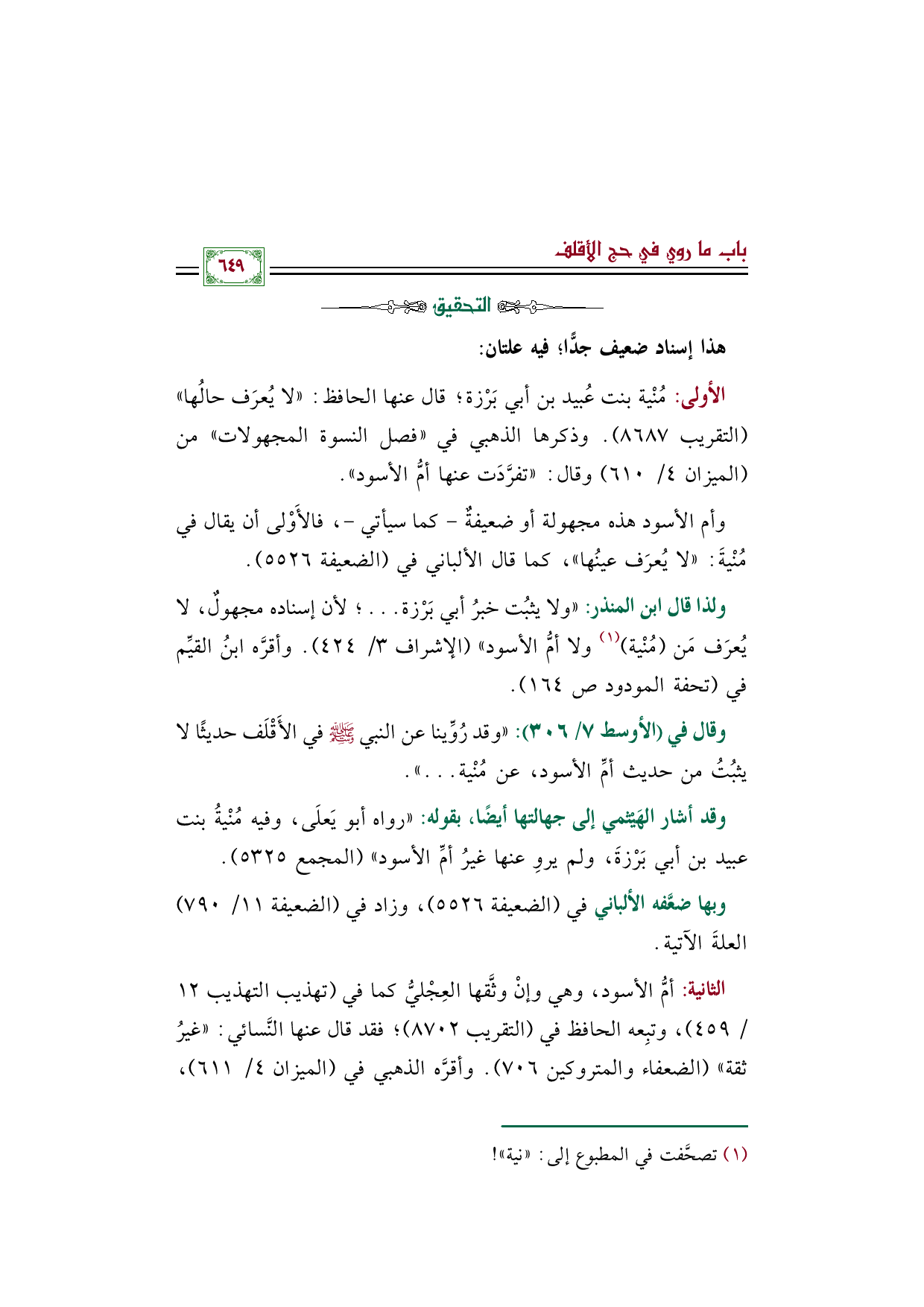 الثانية: أمُّ الأسود، وهي وإنْ وثَّقها العِجْليُّ كما في (تهذيب التهذيب ١٢/ ٤٥٩)، وتبِعه الحافظ في (التقريب ٨٧٠٢)؛ فقد قال عنها النَّسائي: "غيرُ ثقة" (الضعفاء والمتروكين ٧٠٦). وأقرَّه الذهبي في (الميزان ٤/ ٦١١)،