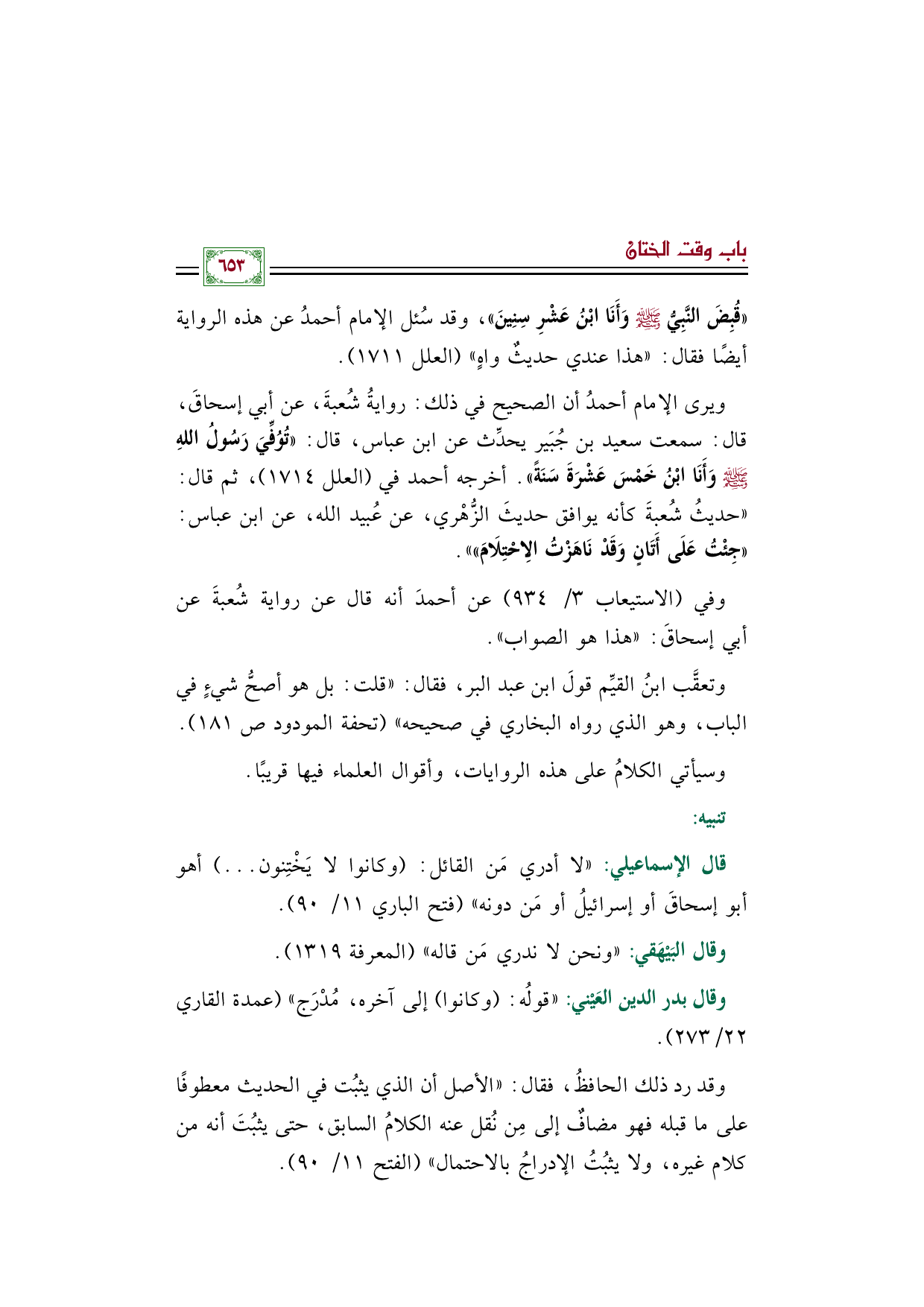 ويرى الإمام أحمدُ أن الصحيح في ذلك: روايةُ شُعبةَ، عن أبي إسحاقَ، قال: سمعت سعيد بن جُبَير يحدِّث عن ابن عباس، قال: ((تُوُفِّيَ رَسُولُ اللهِ صَلَّى اللهُ عَلَيْهِ وَسَلَّمَ وَأَنَا ابْنُ خَمْسَ عَشْرَةَ سَنَةً)). أخرجه أحمد في (العلل ١٧١٤)، ثم قال: "حديثُ شُعبةَ كأنه يوافق حديثَ الزُّهْري، عن عُبيد الله، عن ابن عباس: ((جِئْتُ عَلَى أَتَانٍ وَقَدْ نَاهَزْتُ الِاحْتِلَامَ)) ".