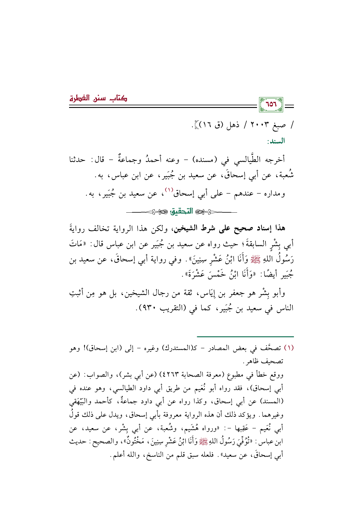 ووقع خطأ في مطبوع (معرفة الصحابة ٤٢٦٣) (عن أبي بشر)، والصواب: (عن أبي إسحاق)، فقد رواه أبو نُعَيم من طريق أبي داود الطيالسي، وهو عنده في (المسند) عن أبي إسحاق، وكذا رواه عن أبي داود جماعةٌ، كأحمد والبَيْهَقي وغيرهما. ويؤكد ذلك أن هذه الرواية معروفة بأبي إسحاق، ويدل على ذلك قولُ أبي نُعَيم - عَقِبها -: "ورواه هُشَيم، وشُعبة، عن أبي بِشْر، عن سعيد، عن ابن عباس: «تُوُفِّيَ رَسُولُ اللهِ صَلَّى اللهُ عَلَيْهِ وَسَلَّمَ وَأَنَا ابْنُ عَشْرِ سِنِينَ، مَخْتُونٌ»، والصحيح: حديث أبي إسحاقَ، عن سعيد". فلعله سبق قلم من الناسخ، والله أعلم.