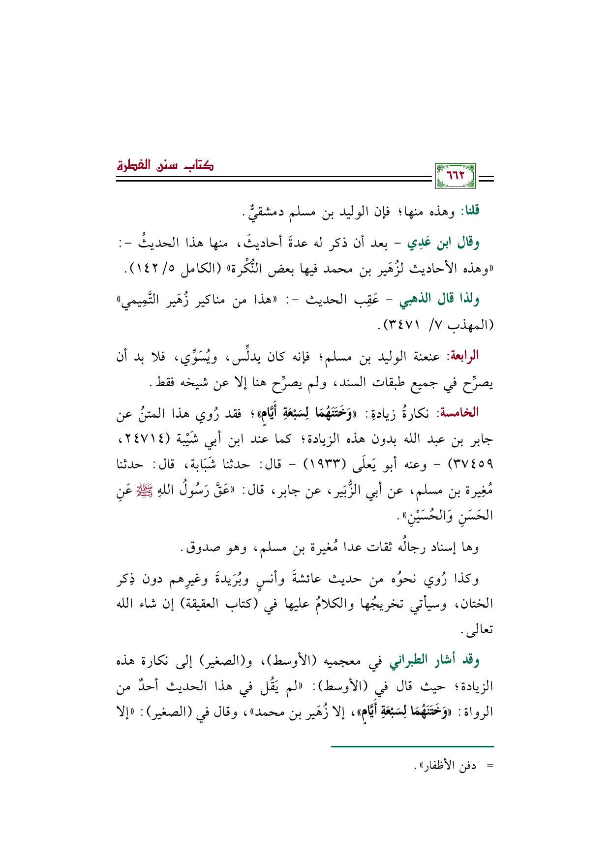 الخامسة: نكارةُ زيادةِ: ((وَخَتَنَهُمَا لِسَبْعَةِ أَيَّامٍ))؛ فقد رُوي هذا المتنُ عن جابر بن عبد الله بدون هذه الزيادة؛ كما عند ابن أبي شَيْبة (٢٤٧١٤، ٣٧٤٥٩) - وعنه أبو يَعلَى (١٩٣٣) - قال: حدثنا شَبَابة، قال: حدثنا مُغِيرة بن مسلم، عن أبي الزُّبَير، عن جابر، قال: ((عَقَّ رَسُولُ اللهِ صَلَّى اللهُ عَلَيْهِ وَسَلَّمَ عَنِ الحَسَنِ وَالحُسَيْنِ)).