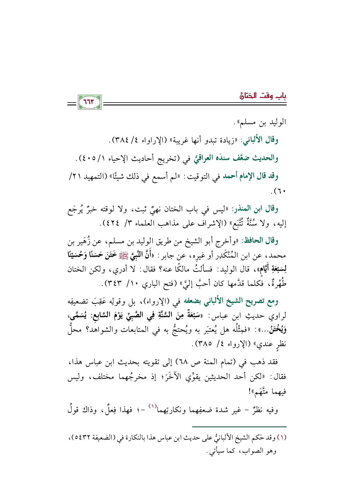 * ومع تصريح الشيخ الألباني بضعفه في (الإرواء)، بل وقولِه عَقِبَ تضعيفِه لراوي حديثِ ابن عباس: ((سَبْعَةٌ مِنَ السُّنَّةِ فِي الصَّبِيِّ يَوْمَ السَّابِعِ: يُسَمَّى، وَيُخْتَنُ ... )): "فمِثْلُه هل يُعتبَر به ويُحتجُّ به في المتابعات والشواهد؟ محلُّ نظرٍ عندي" (الإرواء ٤/ ٣٨٥).