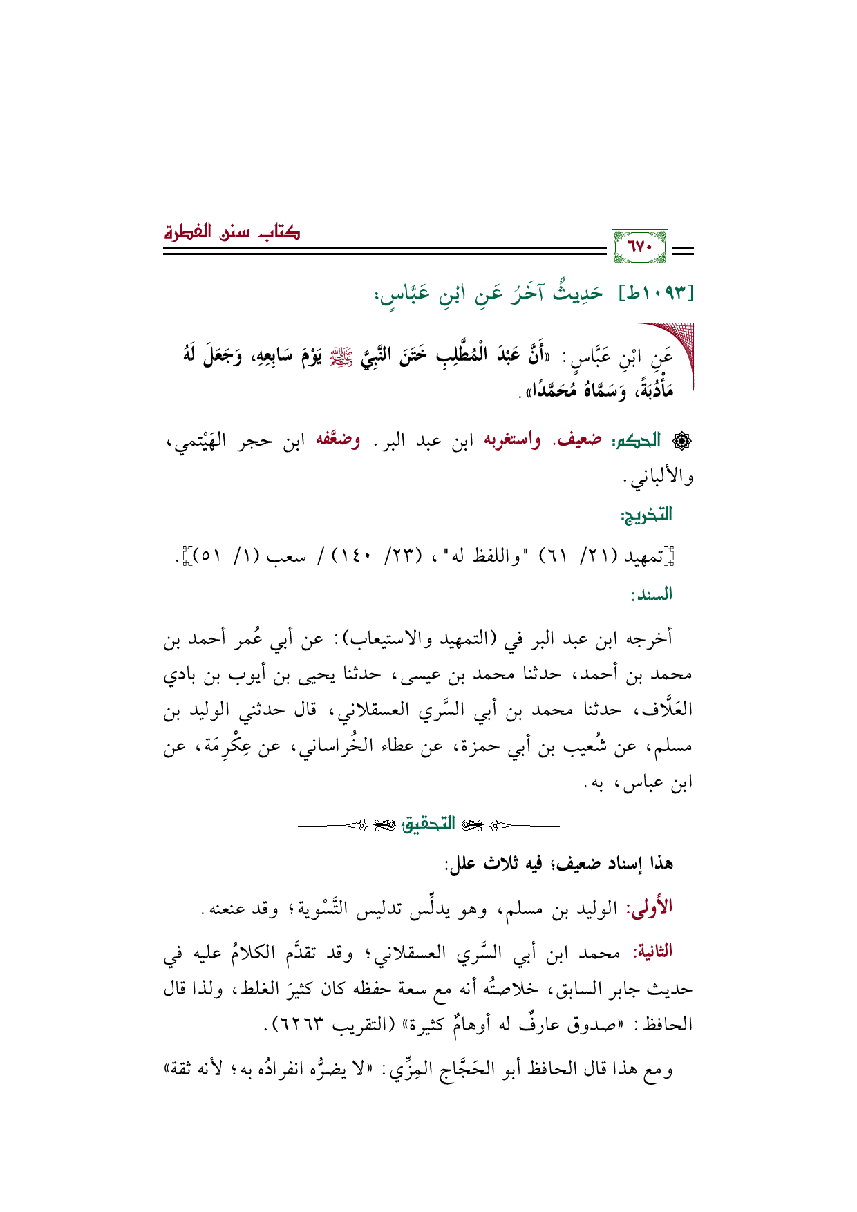 أخرجه ابن عبد البر في (التمهيد والاستيعاب): عن أبي عُمر أحمد بن محمد بن أحمد، حدثنا محمد بن عيسى، حدثنا يحيى بن أيوب بن بادي العَلَّاف، حدثنا محمد بن أبي السَّري العسقلاني، قال حدثني الوليد بن مسلم، عن شُعيب بن أبي حمزة، عن عطاء الخُراساني، عن عِكْرِمَة، عن ابن عباس، به.