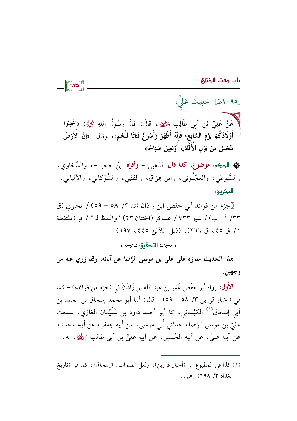 الأول: رواه أبو حفْص عُمر بن عبد الله بن زَاذَانَ في "جزء من فوائده"- كما في (أخبار قزوين ٣/ ٥٨ - ٥٩) - قال: أنبا أبو محمد إسحاق بن محمد بن أبي إسحاق (¬١) الكَيْساني، ثنا أبو أحمد داود بن سُلَيْمان الغازي، سمعت عليَّ بن موسى الرِّضا، حدثني أَبي موسى، عن أبيه جعفر، عن أبيه محمد، عن أبيه عليٍّ، عن أبيه الحُسين، عن أبيه عليِّ بن أبي طالب رضي الله عنه، به.