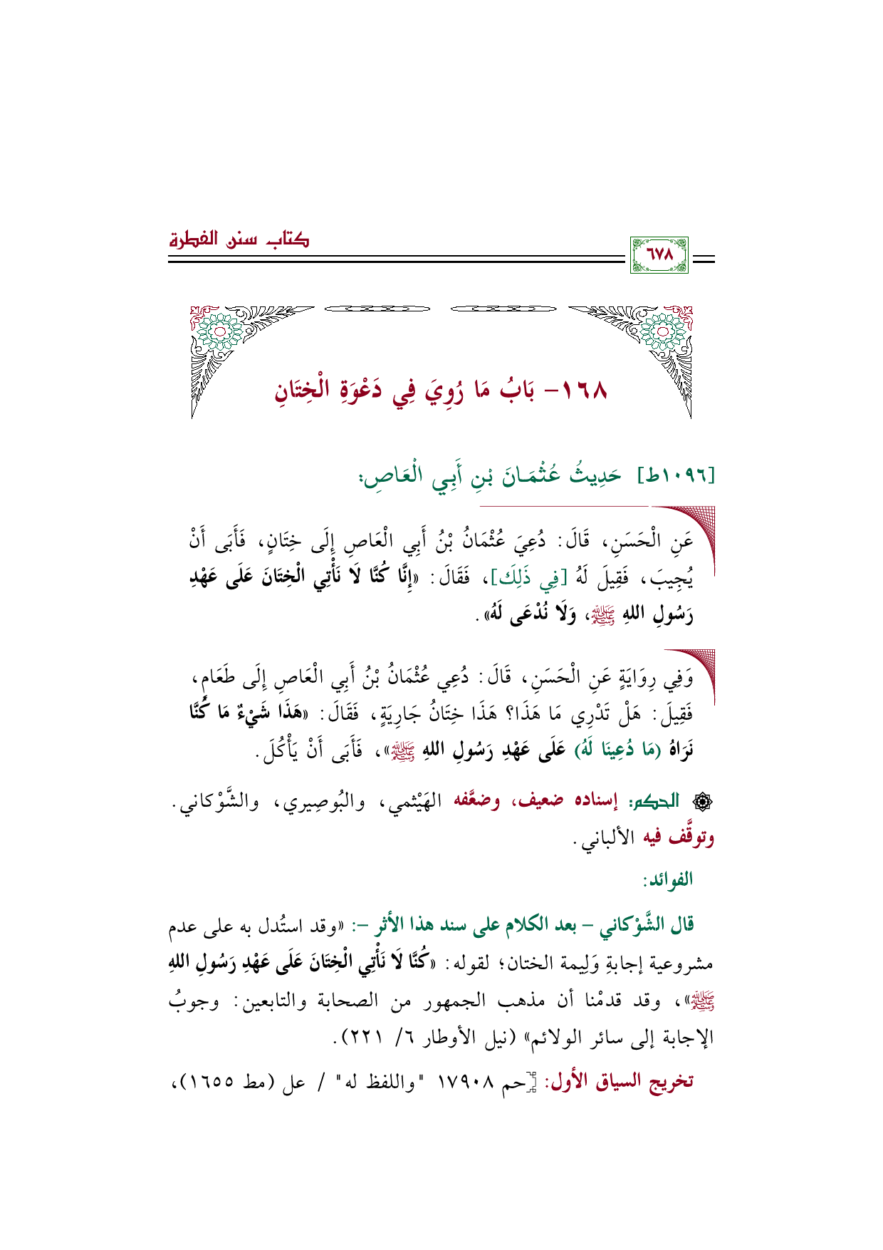 قال الشَّوْكاني- بعد الكلام على سند هذا الأثر-: "وقد استُدل به على عدم مشروعية إجابةِ وَلِيمة الختان؛ لقوله: ((كُنَّا لَا نَأْتِي الْخِتَانَ عَلَى عَهْدِ رَسُولِ اللهِ صَلَّى اللهُ عَلَيْهِ وَسَلَّمَ))، وقد قدمْنا أن مذهب الجمهور من الصحابة والتابعين: وجوبُ الإجابة إلى سائر الولائم" (نيل الأوطار ٦/ ٢٢١).