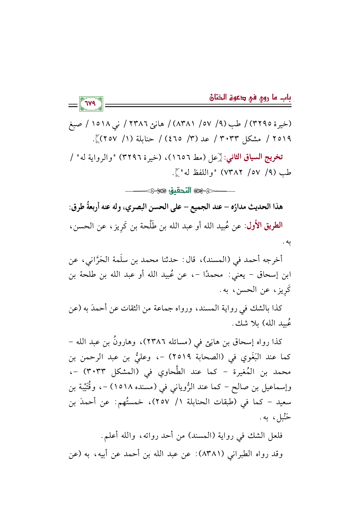 كذا رواه إسحاق بن هانِئ في (مسائله ٢٣٨٦)، وهارونُ بن عبد الله- كما عند البَغَوي في (الصحابة ٢٥١٩) -، وعليُّ بن عبد الرحمن بن محمد بن المُغيرة- كما عند الطَّحاوي في (المشكل ٣٠٣٣) -، وإسماعيل بن صالح- كما عند الرُّوياني في (مسنده ١٥١٨) -، وقُتَيْبة بن سعيد- كما في (طبقات الحنابلة ١/ ٢٥٧)، خمستُهم: عن أحمدَ بن حَنْبل، به.