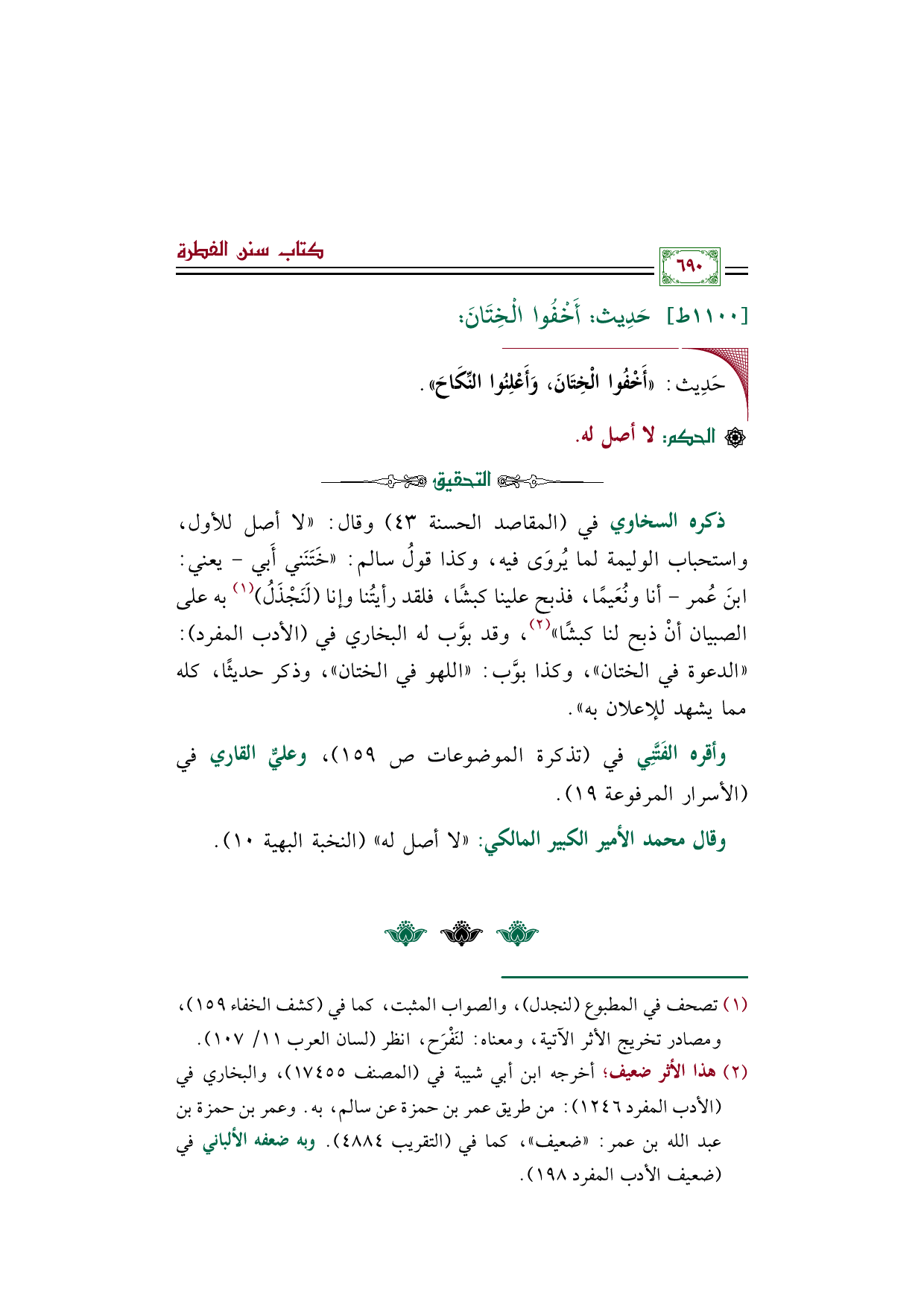 ذكره السخاوي في (المقاصد الحسنة ٤٣) وقال: "لا أصل للأول، واستحباب الوليمة لما يُروَى فيه، وكذا قولُ سالم: "خَتَنَني أَبي- يعني: ابنَ عُمر- أنا ونُعَيمًا، فذبح علينا كبشًا، فلقد رأيتُنا وإنا (لَنَجْذَلُ) (¬١) به على الصبيان أنْ ذبح لنا كبشًا" (¬٢)، وقد بوَّب له البخاري في "الأدب المفرد": "الدعوة في الختان"، وكذا بوَّب: "اللهو في الختان"، وذكر حديثًا، كله مما يشهد للإعلان به".
