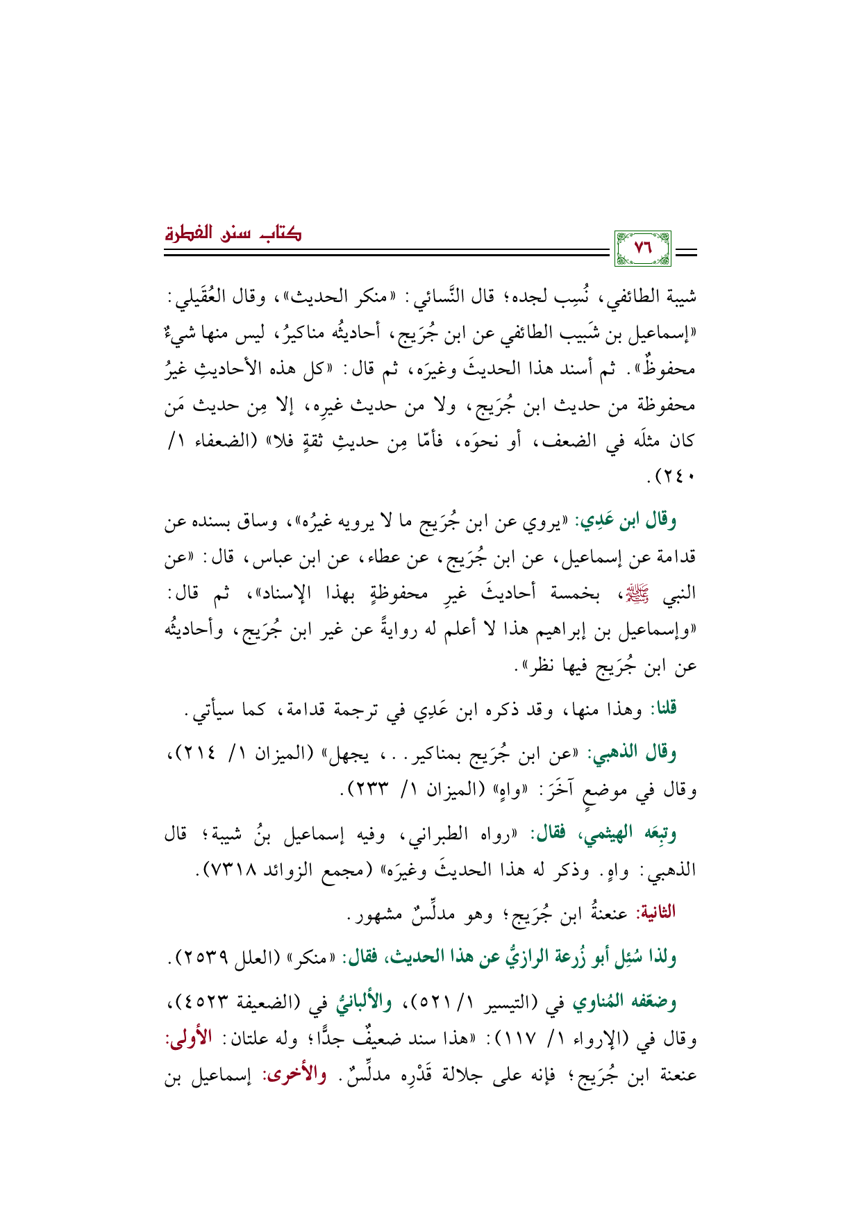 وقال ابن عَدِي: "يروي عن ابن جُرَيج ما لا يرويه غيرُه"، وساق بسنده عن قدامة عن إسماعيل، عن ابن جُرَيج، عن عطاء، عن ابن عباس، قال: "عن النبي صلى الله عليه وسلم، بخمسة أحاديثَ غيرِ محفوظةٍ بهذا الإسناد"، ثم قال: "وإسماعيل بن إبراهيم هذا لا أعلم له روايةً عن غير ابن جُرَيج، وأحاديثُه عن ابن جُرَيج فيها نظر".