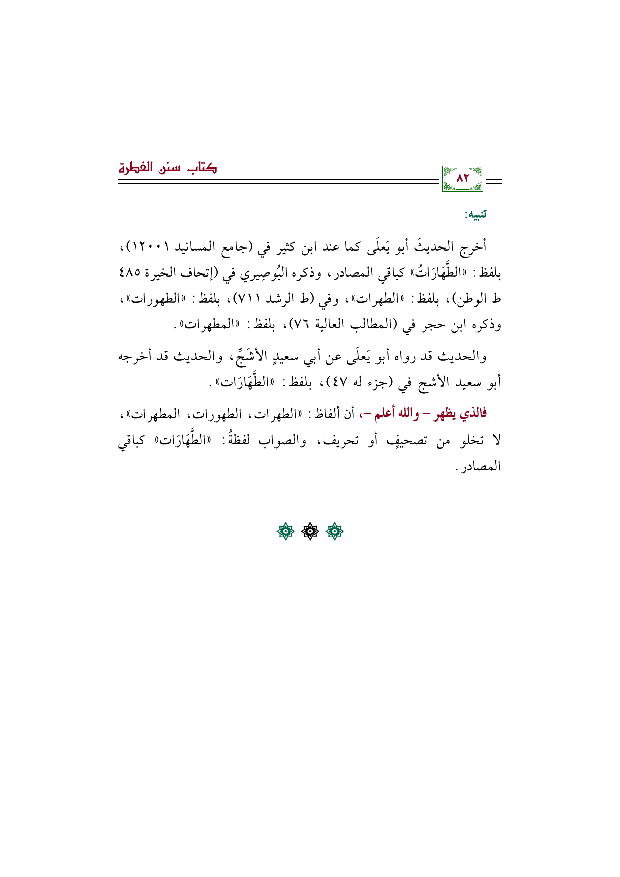 أخرج الحديثَ أبو يَعلَى كما عند ابن كثير في (جامع المسانيد ١٢٠٠١)، بلفظ: "الطَّهَارَاتُ" كباقي المصادر، وذكره البُوصِيري في (إتحاف الخيرة ٤٨٥ ط الوطن)، بلفظ: "الطهرات"، وفي (ط الرشد ٧١١)، بلفظ: "الطهورات"، وذكره ابن حجر في (المطالب العالية ٧٦)، بلفظ: "المطهرات".